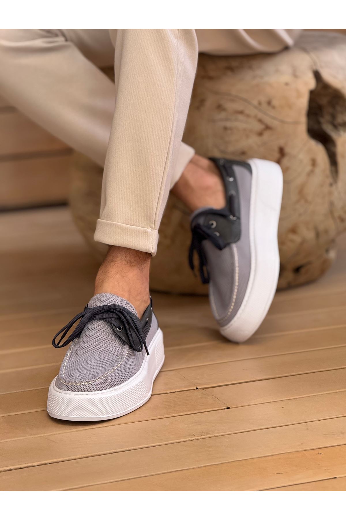 • MirgeShoes Antrasit Bağcıklı Erkek Casual Spor Ayakkabı Triko Kalın BYZ Taban MRG01064920