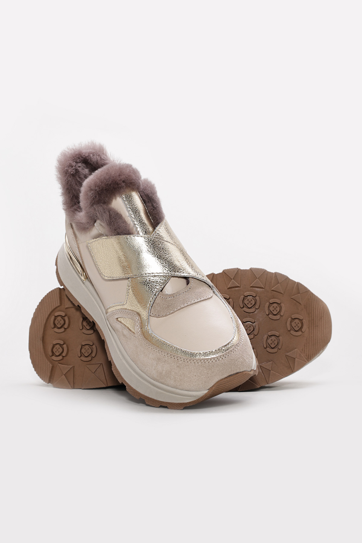MirgeShoes Bej-Altın Bantlı Kadın Casual Ayakkabı İçi Kürklü Dışı Hakiki Deri MRG018871126124273