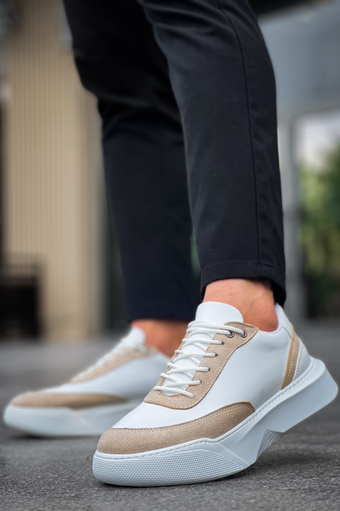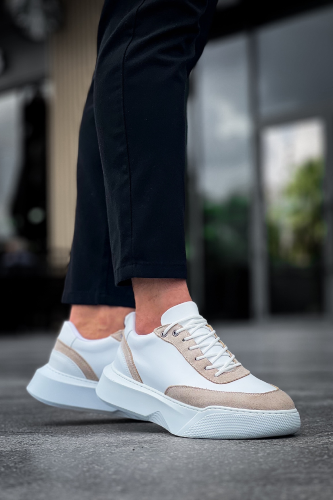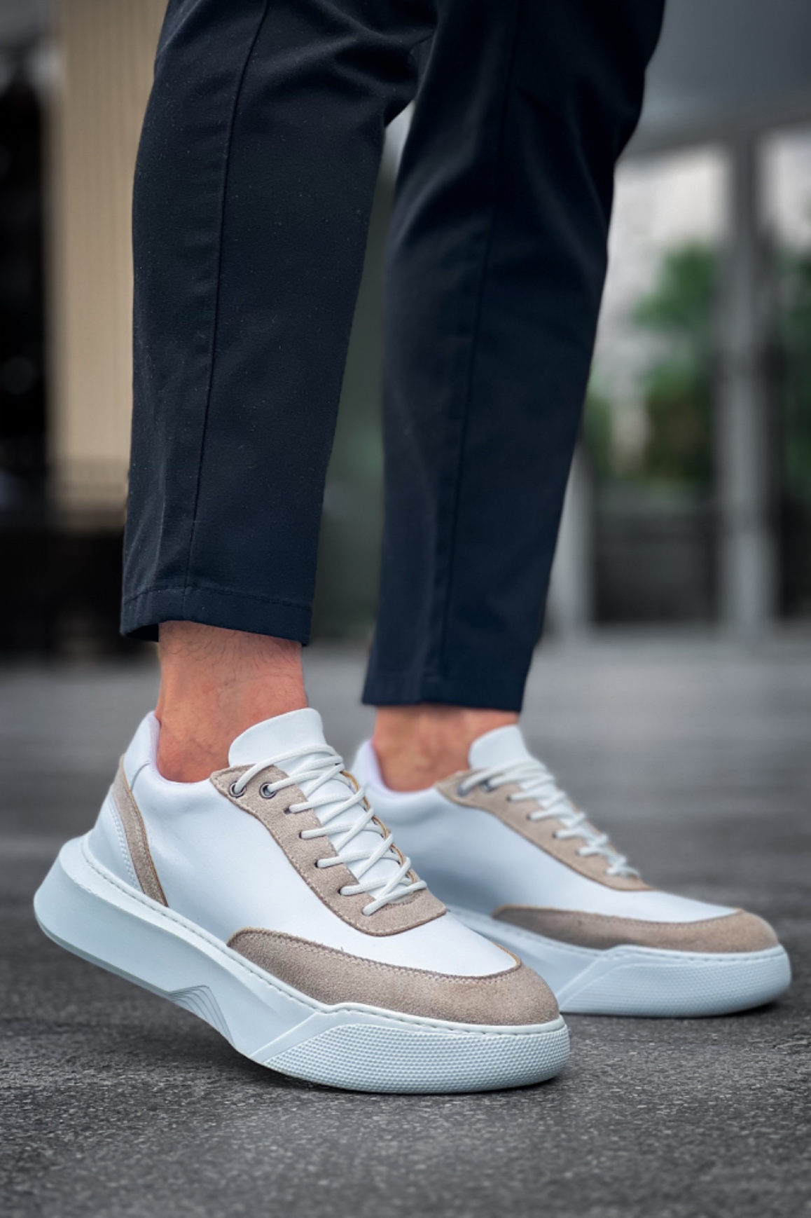 MirgeShoes Beyaz Bağcıklı Erkek Günlük Spor Ayakkabı Krem Parçalı Yüksek BYZ Taban MRG010602672