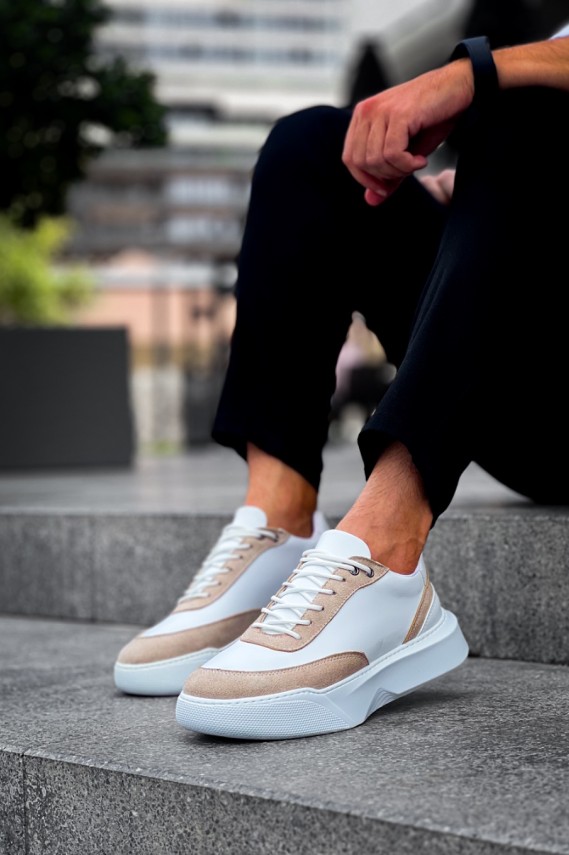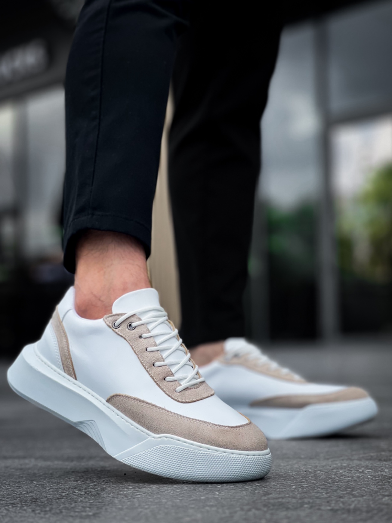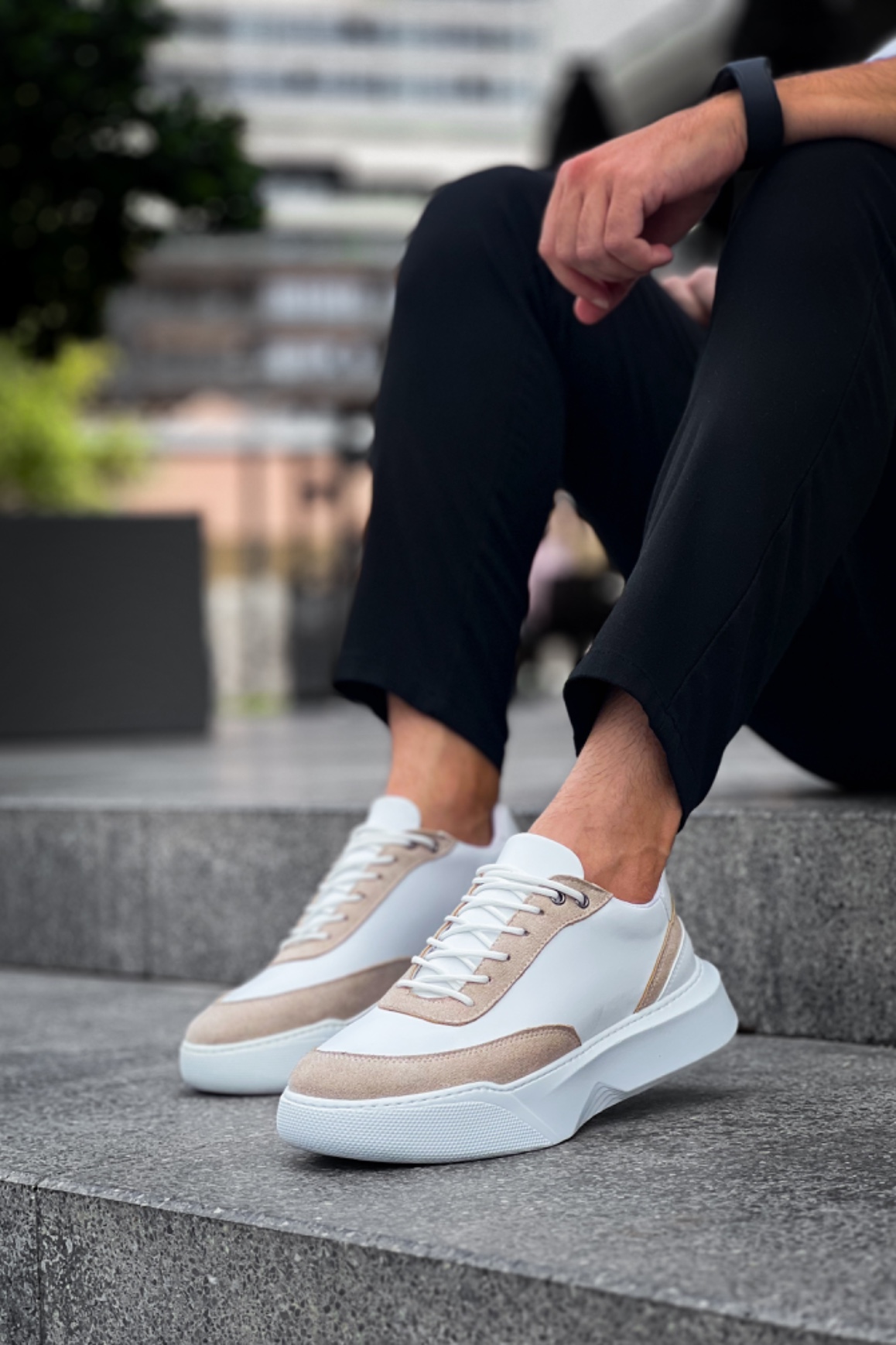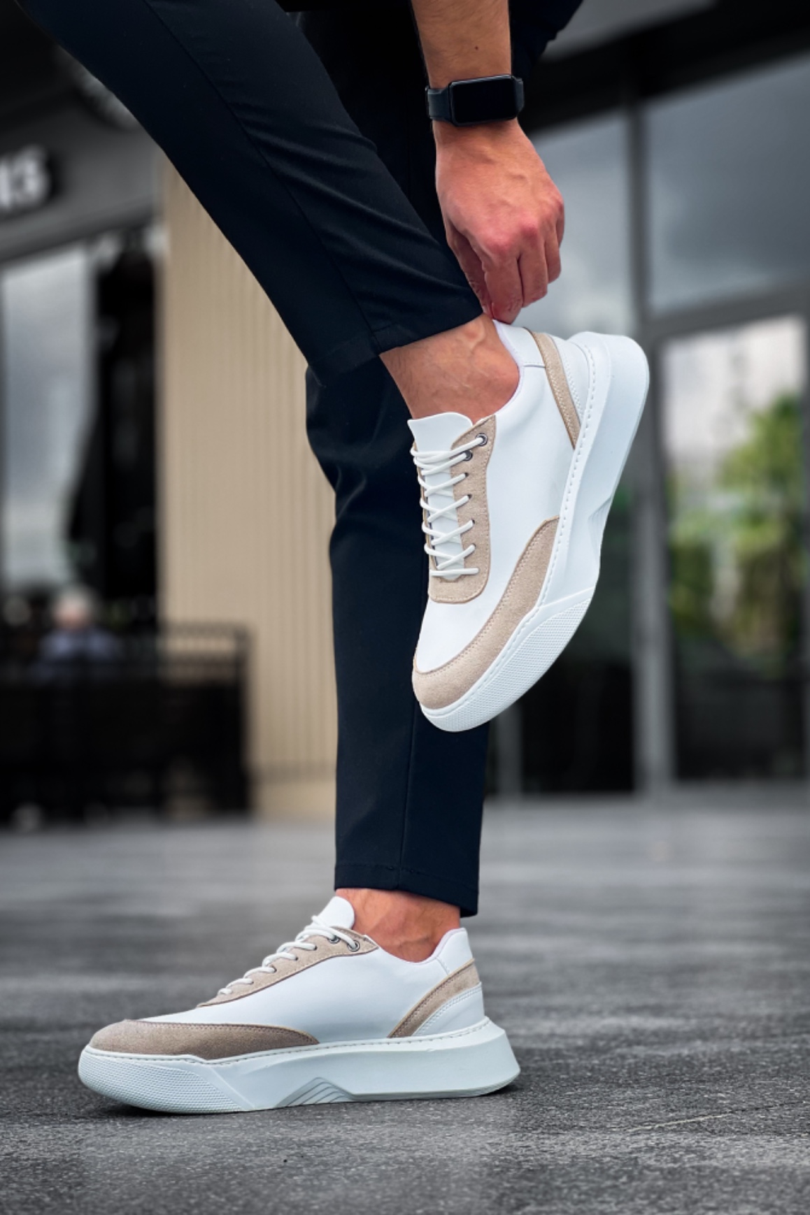 MirgeShoes Beyaz Bağcıklı Erkek Günlük Spor Ayakkabı Krem Parçalı Yüksek BYZ Taban MRG010602672