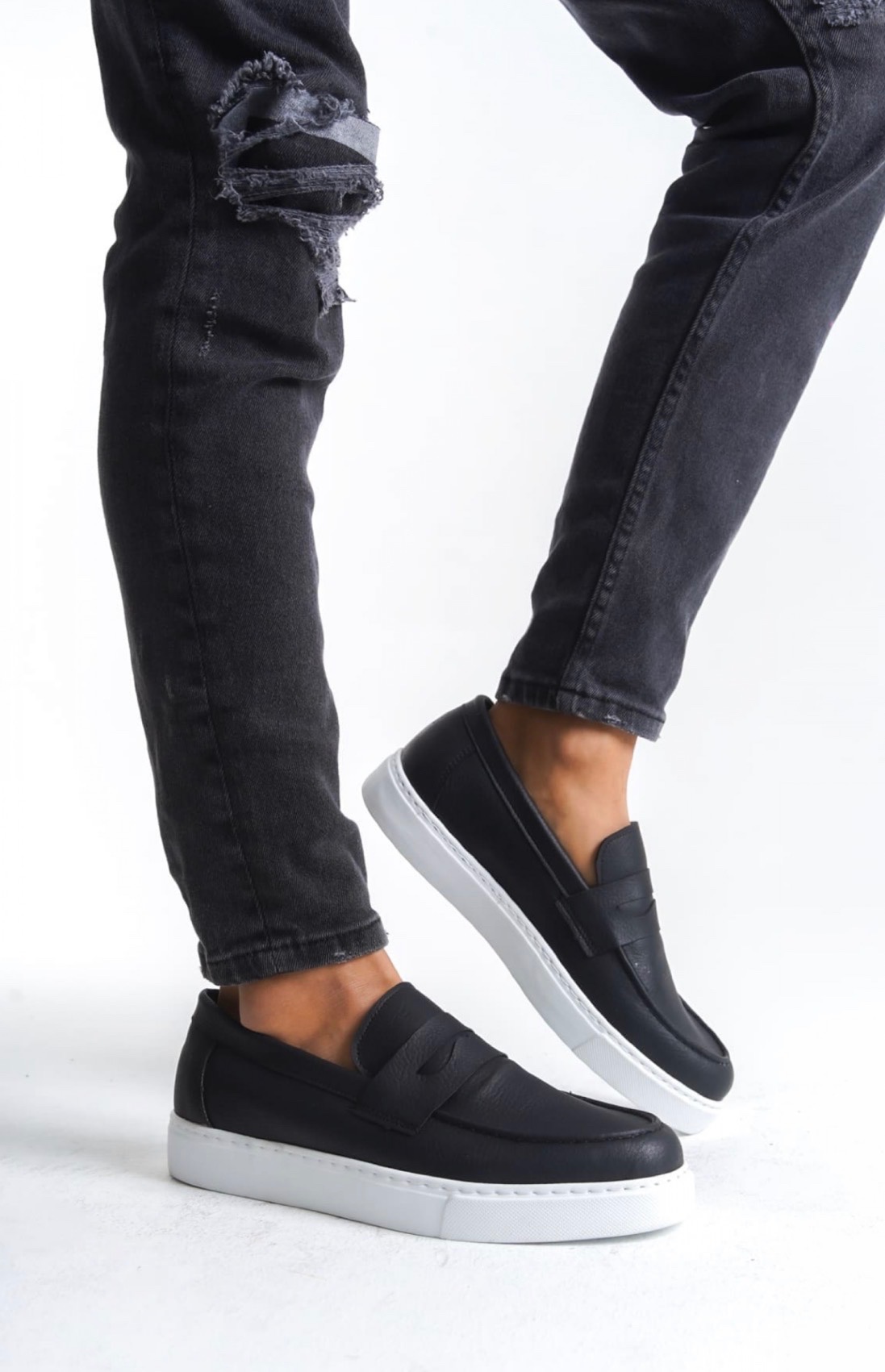 MirgeShoes Siyah Bağcıksız Erkek Loafer Ayakkabı Kuşaklı Yüksek BYZ Taban MRG010602898