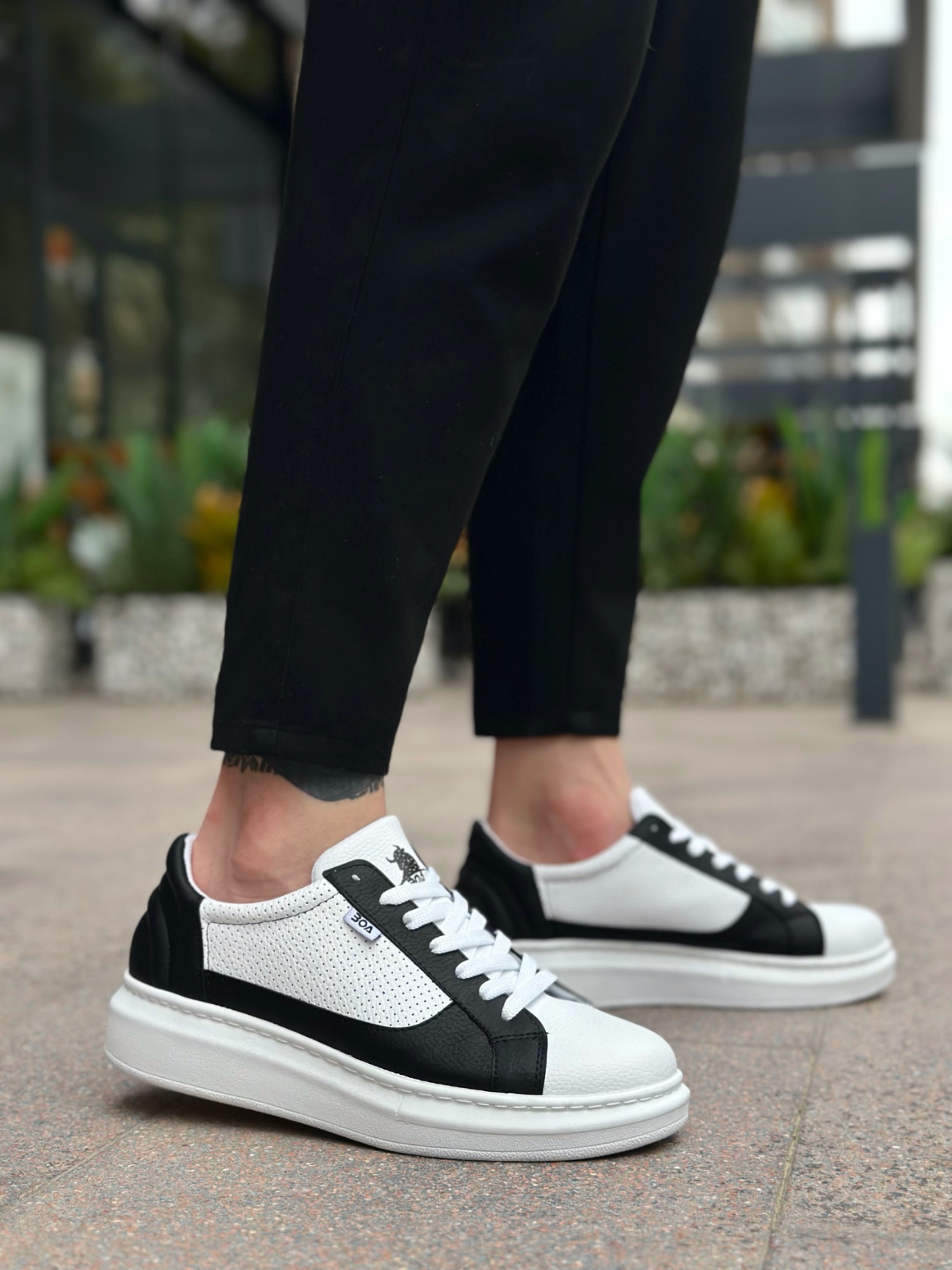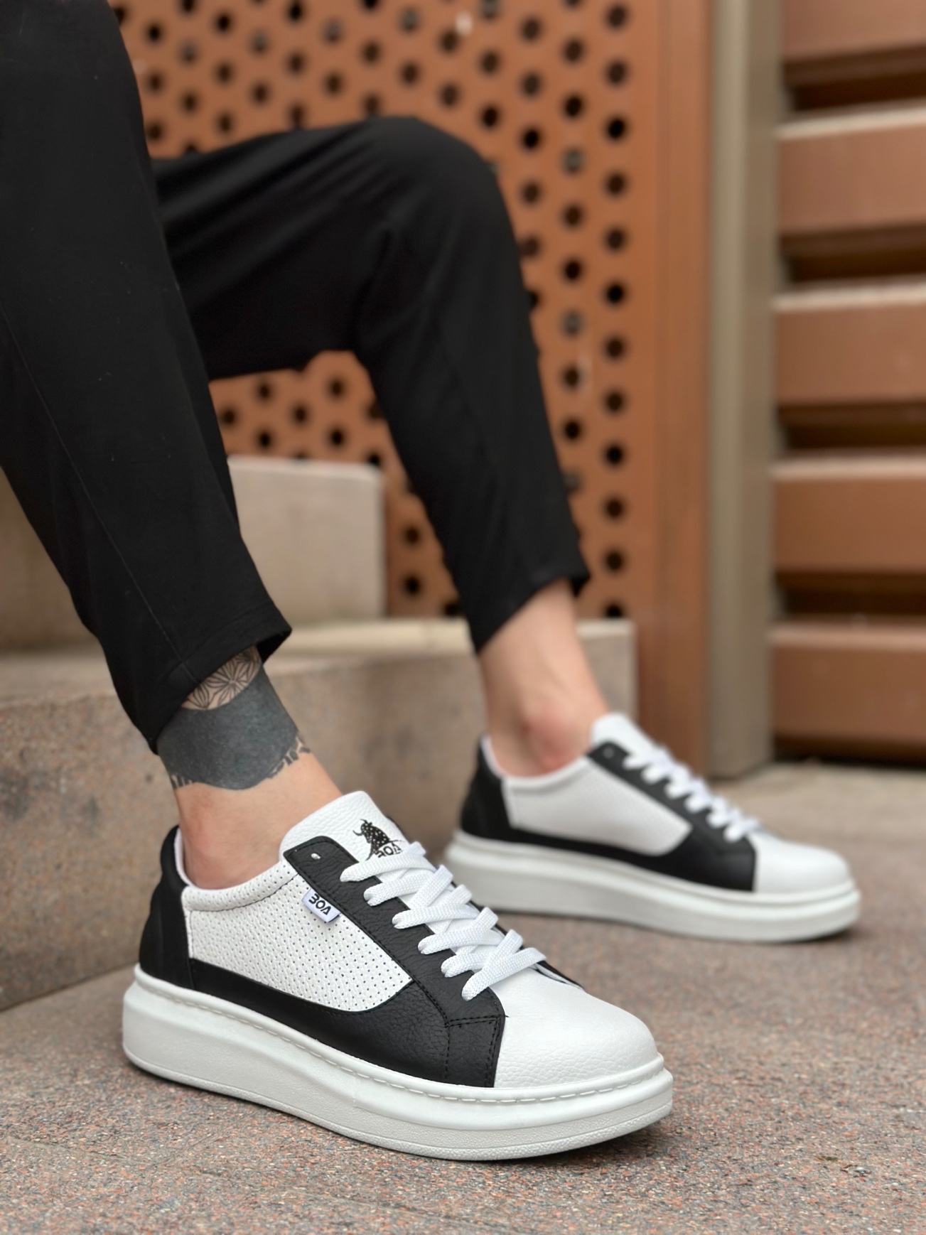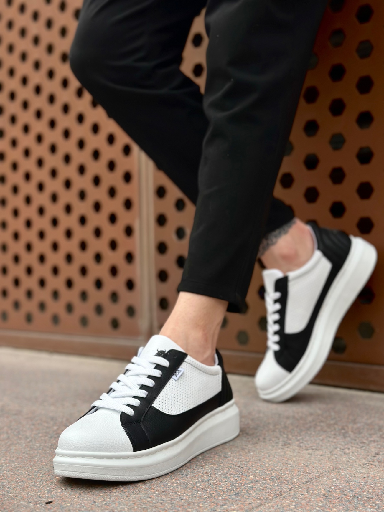 • MirgeShoes Beyaz-Siyah Bağcıklı Erkek Spor Ayakkabı Kalın Yüksek BYZ Taban MRG010602741