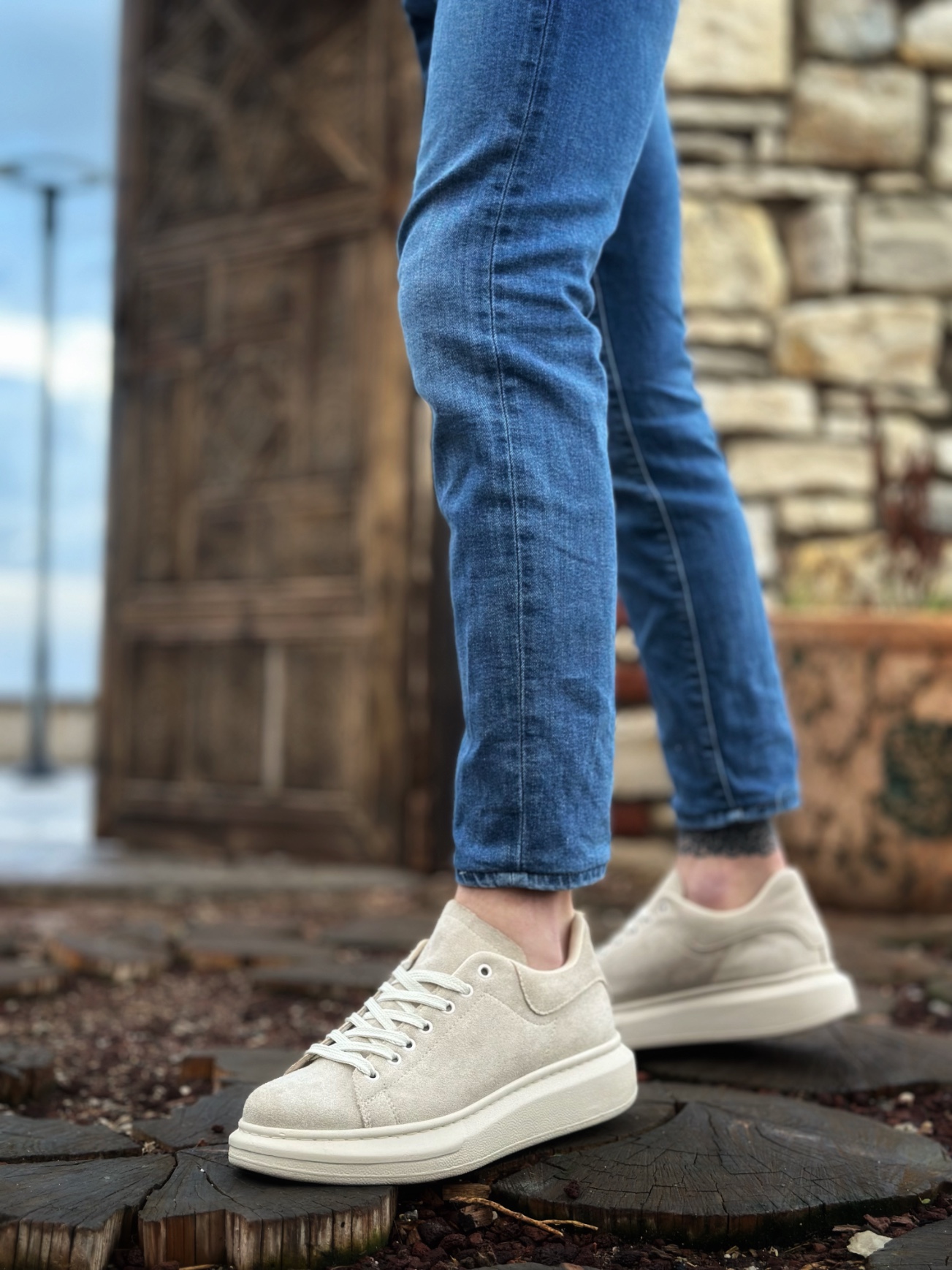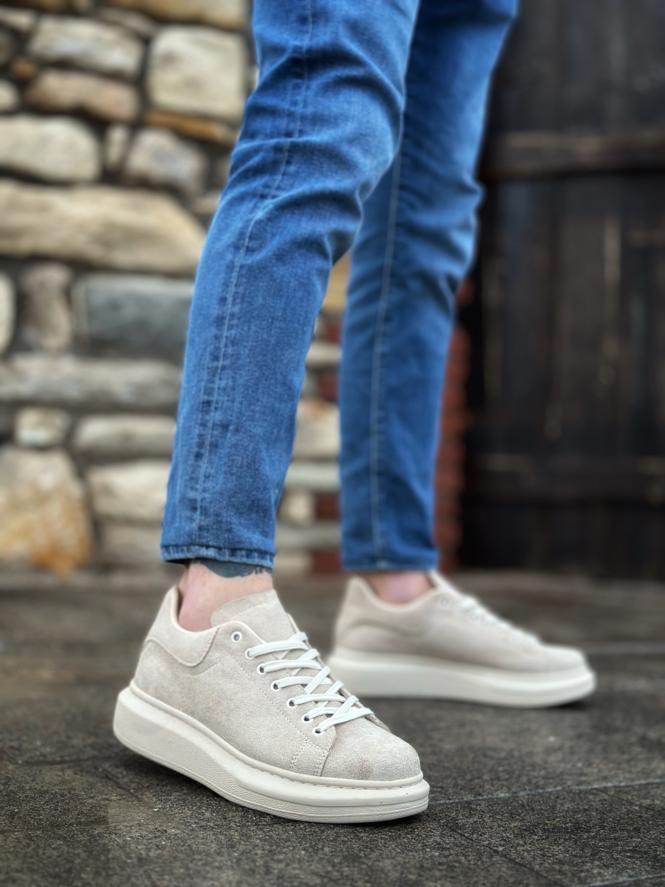 • MirgeShoes Krem Bağcıklı Erkek Spor Ayakkabı Süet Deri Kalın Yüksek KRM Taban MRG010602865