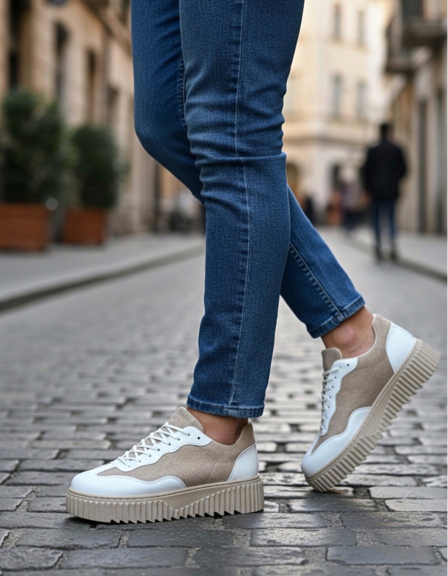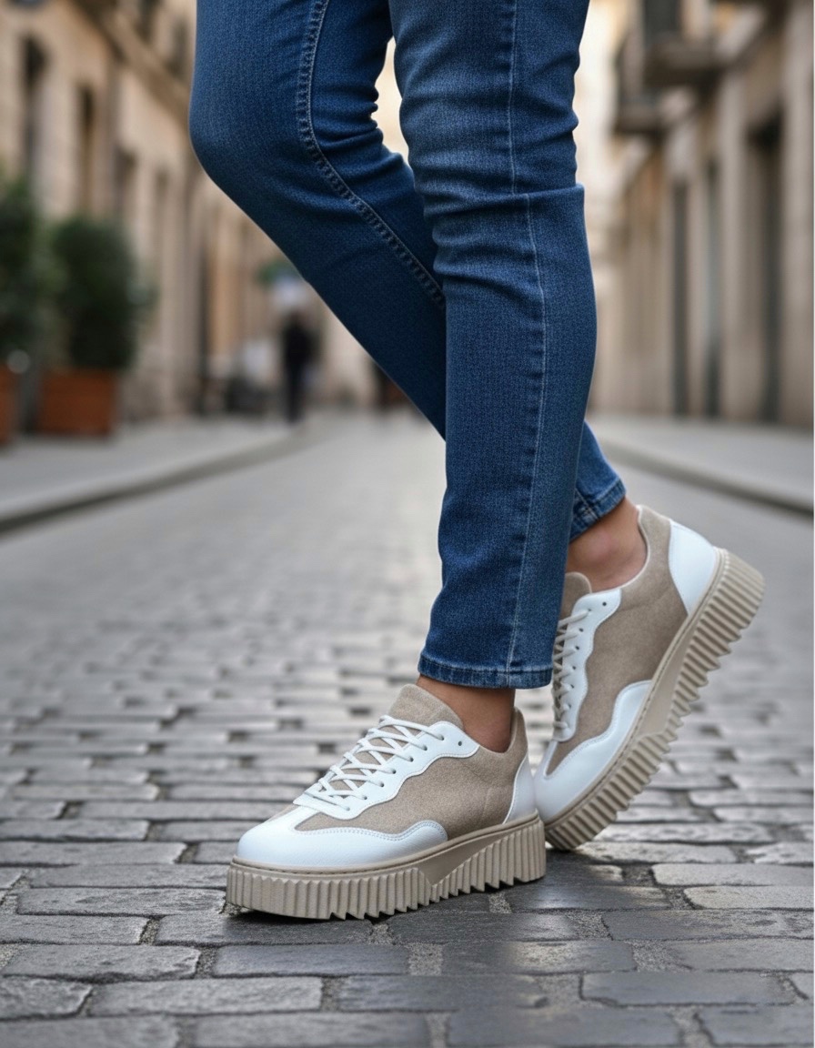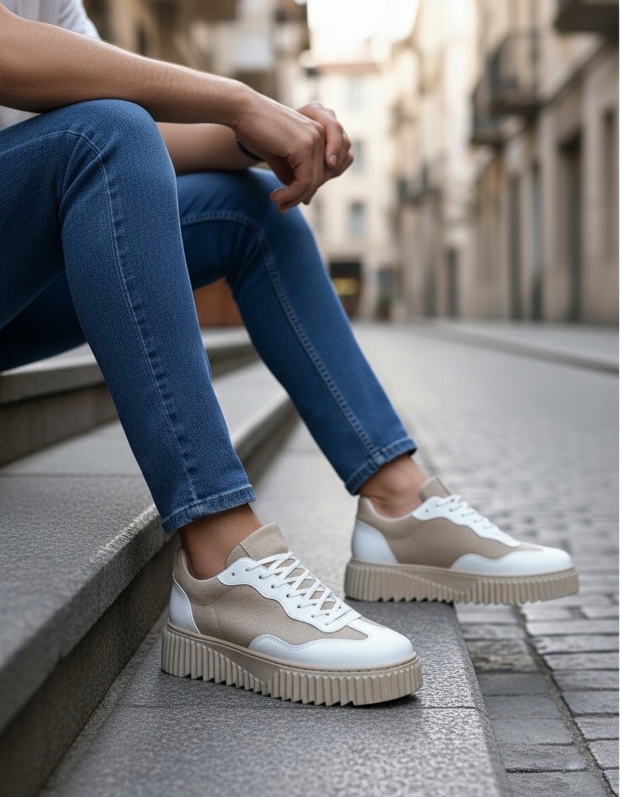 MirgeShoes Krem-Beyaz Erkek Günlük Comfort Ayakkabı Tırtıklı Yüksek Kalın KRM Taban MRG010603120