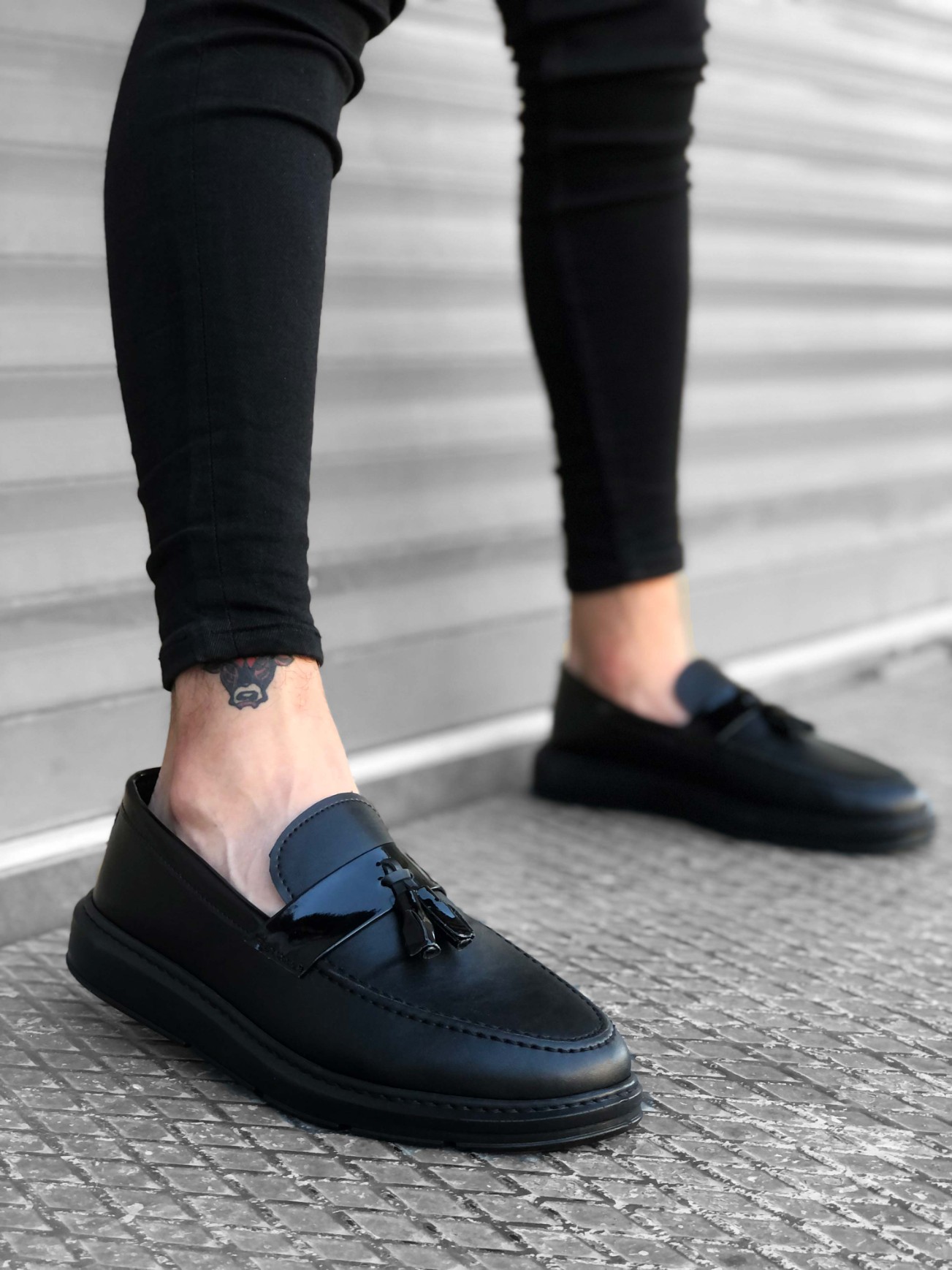 MirgeShoes Siyah Bağcıksız Püsküllü Erkek Loafer Ayakkabı Cilt Detaylı Yüksek SYH Taban MRG01060002323