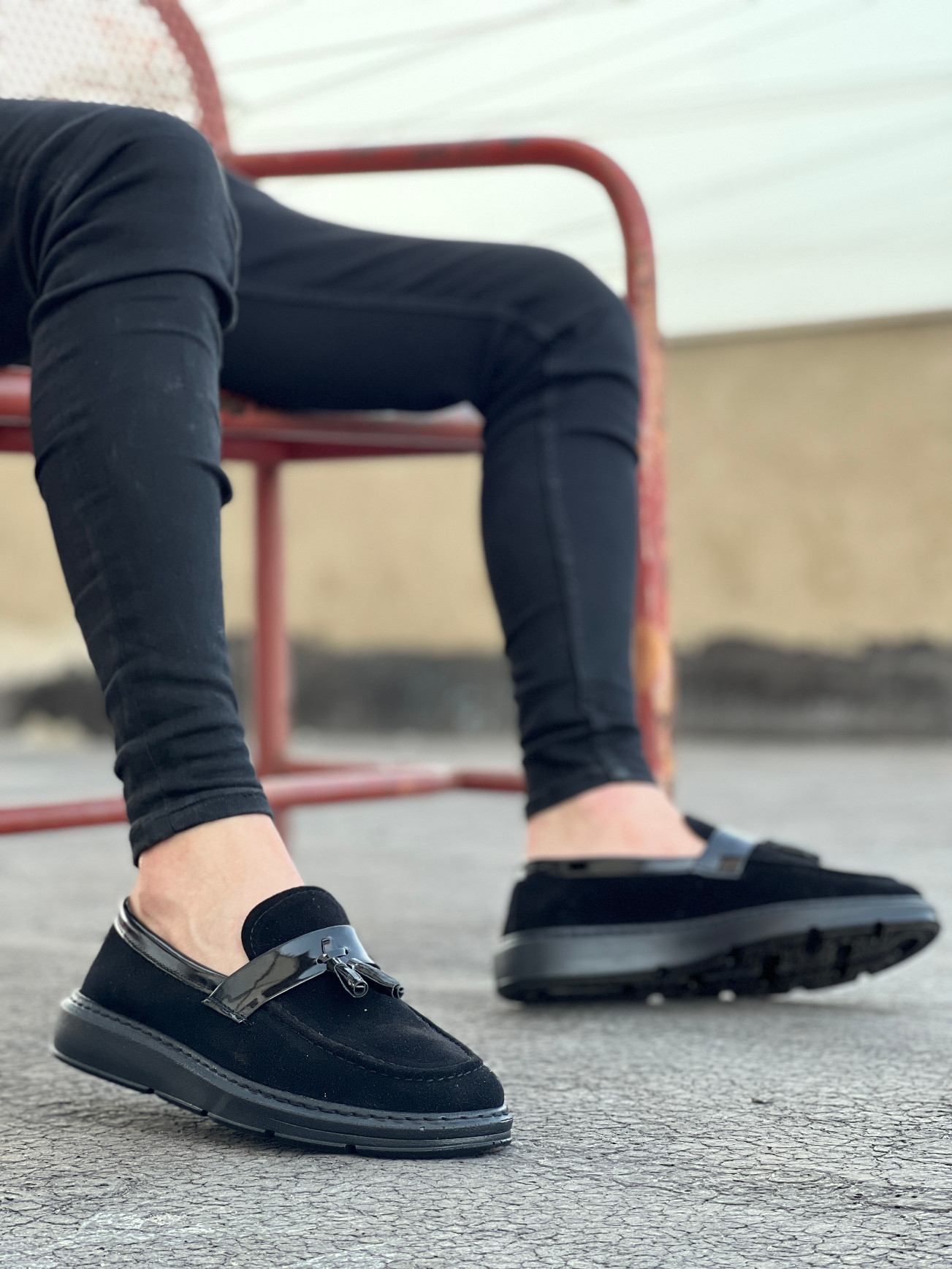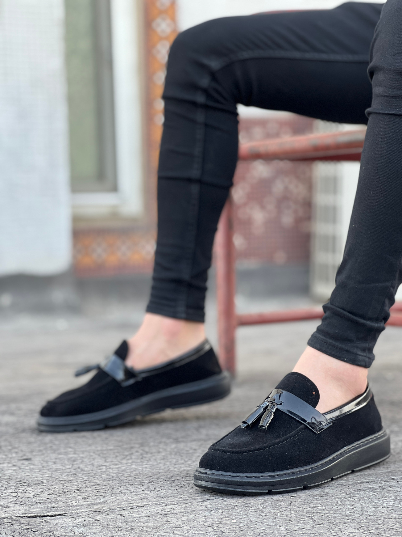 MirgeShoes Siyah Bağcıksız Püsküllü Erkek Loafer Ayakkabı Süet-Cilt Detaylı Yüksek SYH Taban MRG01060002323