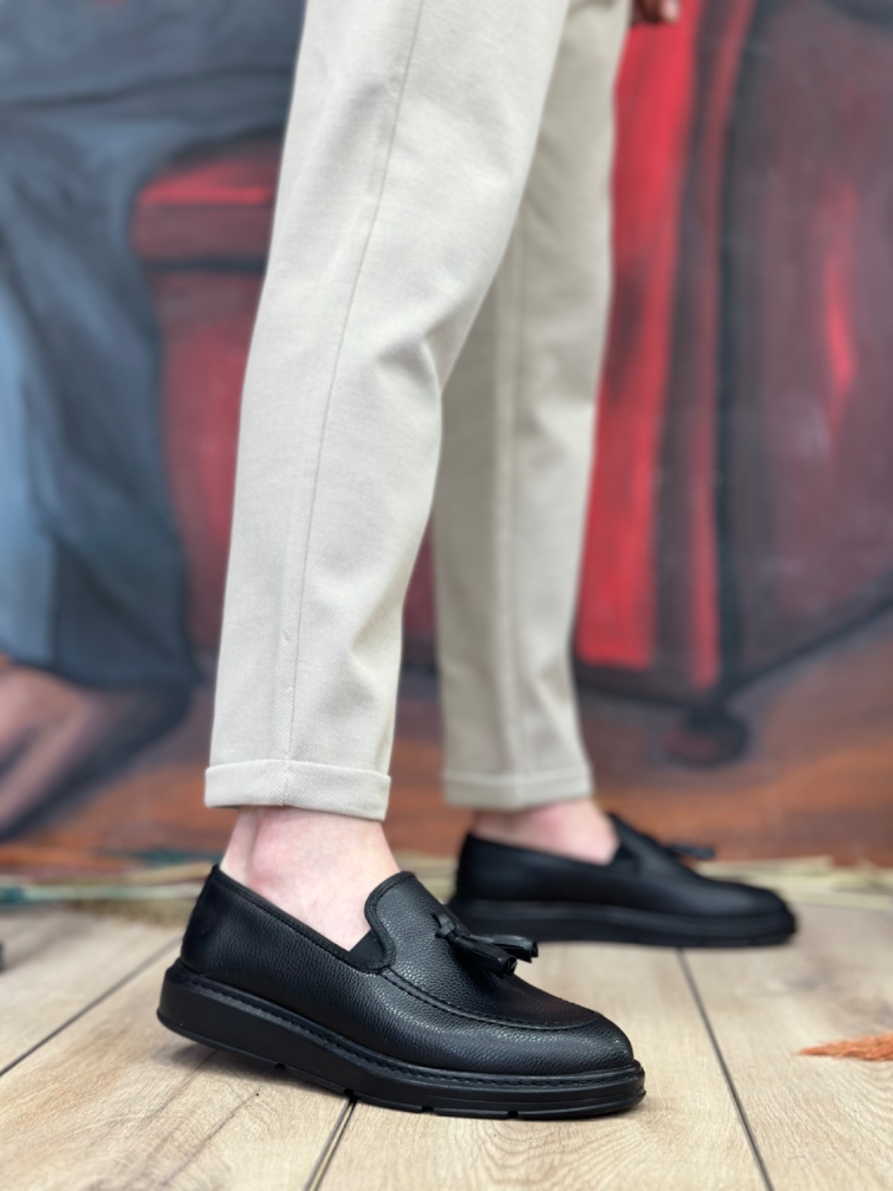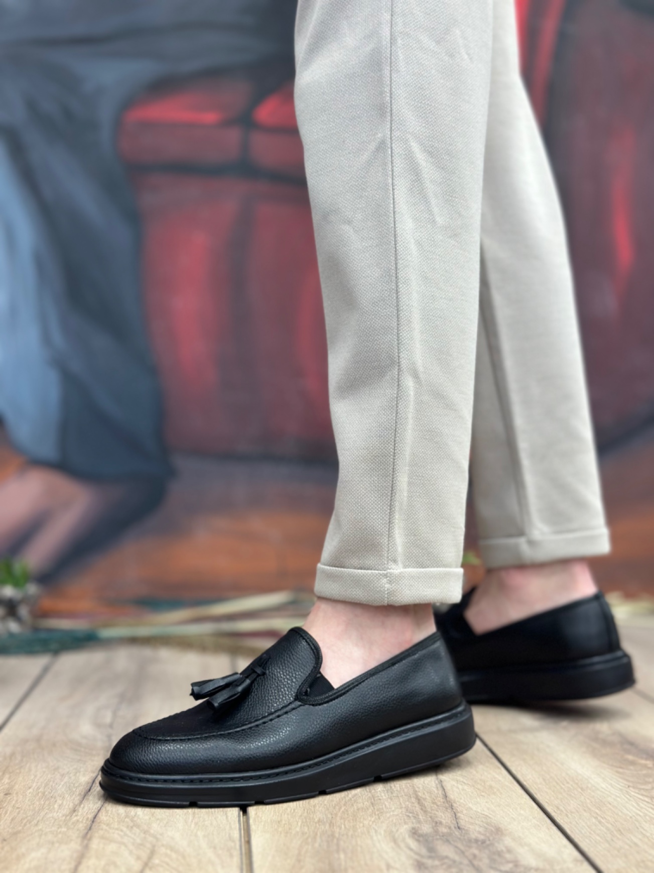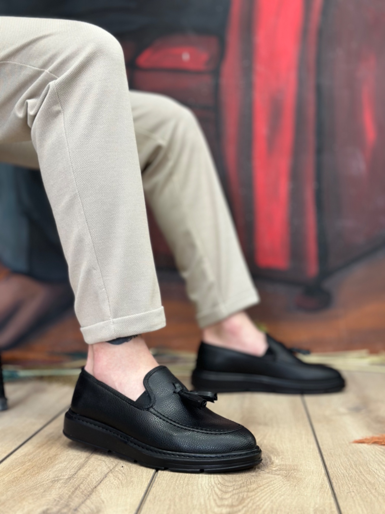 • MirgeShoes Siyah Bağcıksız Püsküllü Erkek Loafer Ayakkabı Mat Süet Detaylı Yüksek SYH Taban MRG01060002323