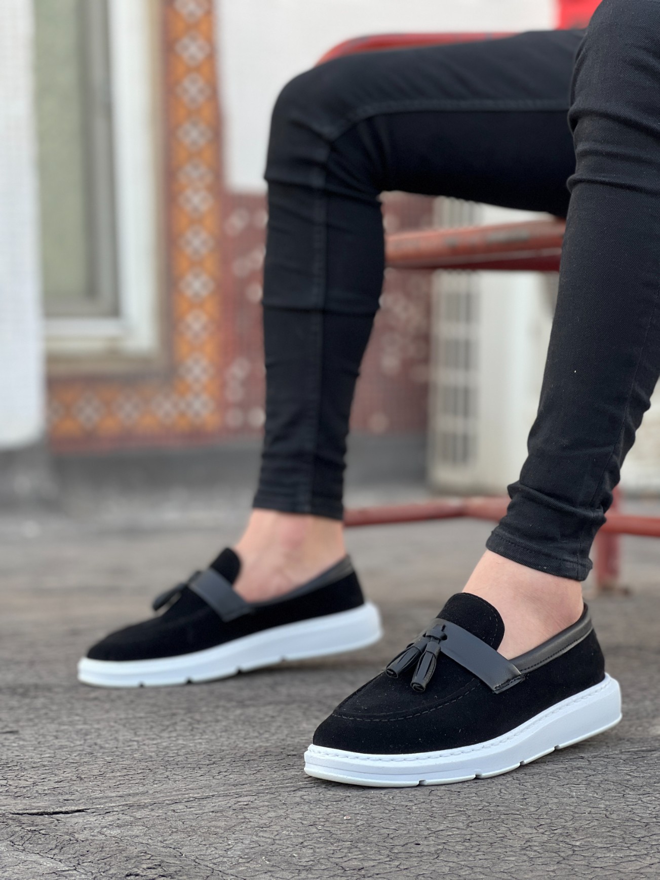 • MirgeShoes Siyah Bağcıksız Püsküllü Erkek Loafer Ayakkabı Mat Cilt Kemerli Yüksek BYZ Taban MRG01060002323