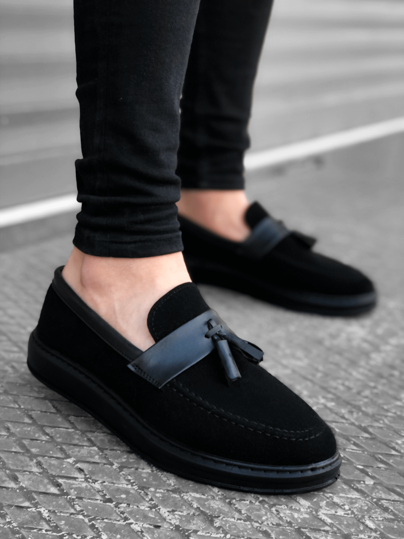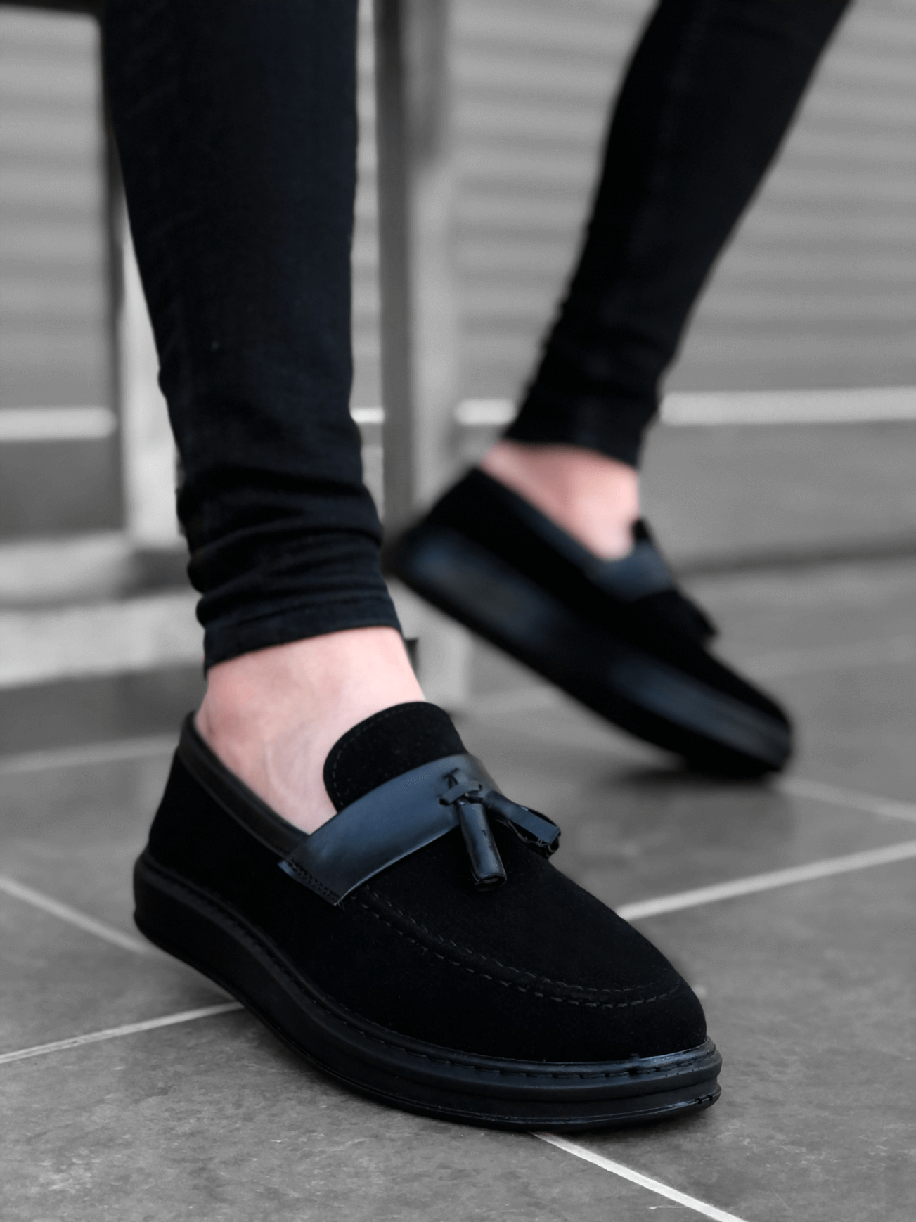 MirgeShoes Siyah Bağcıksız Püsküllü Erkek Loafer Ayakkabı Mat Süet Kemerli Yüksek SYH Taban MRG01060002323