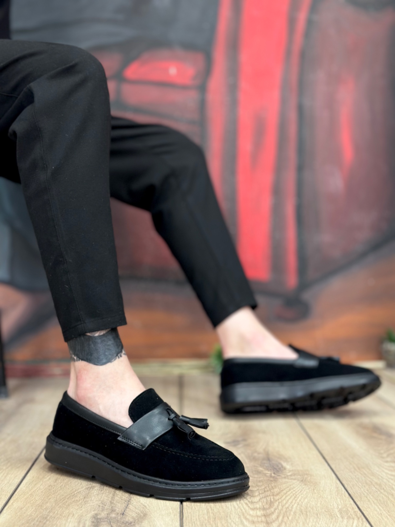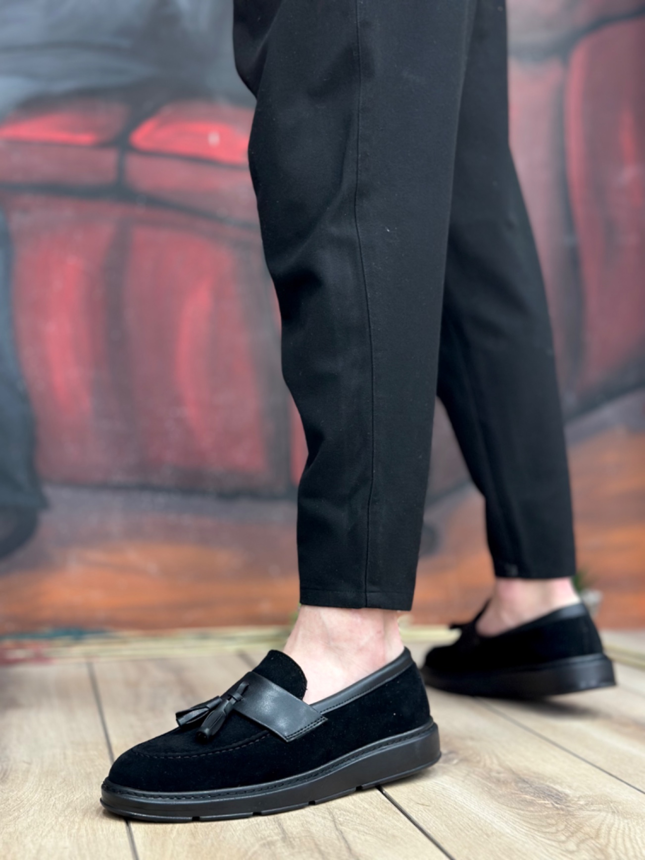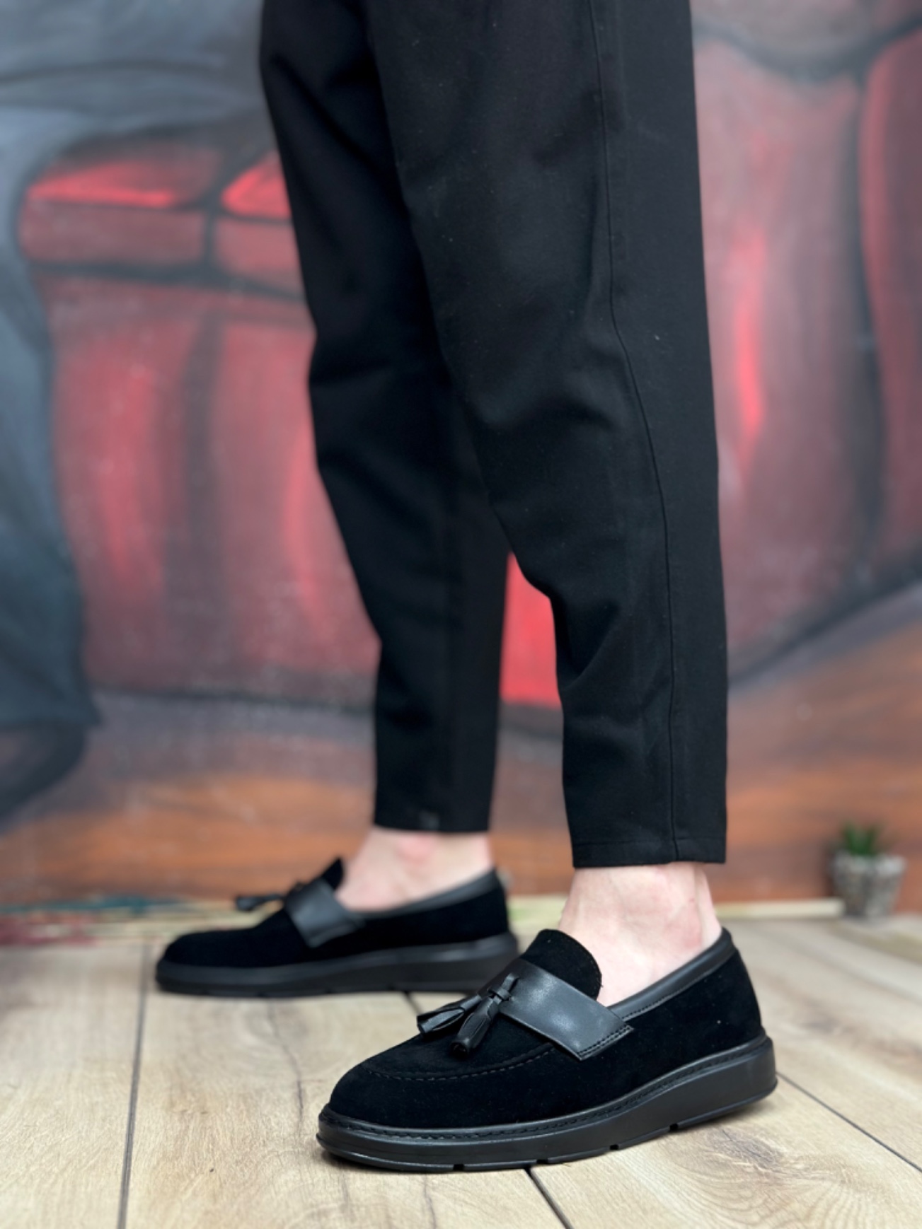 • MirgeShoes Siyah Bağcıksız Püsküllü Erkek Loafer Ayakkabı Mat Süet Kemerli Yüksek SYH Taban MRG01060002323