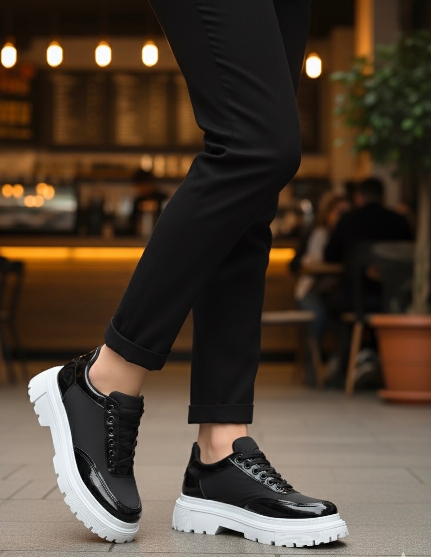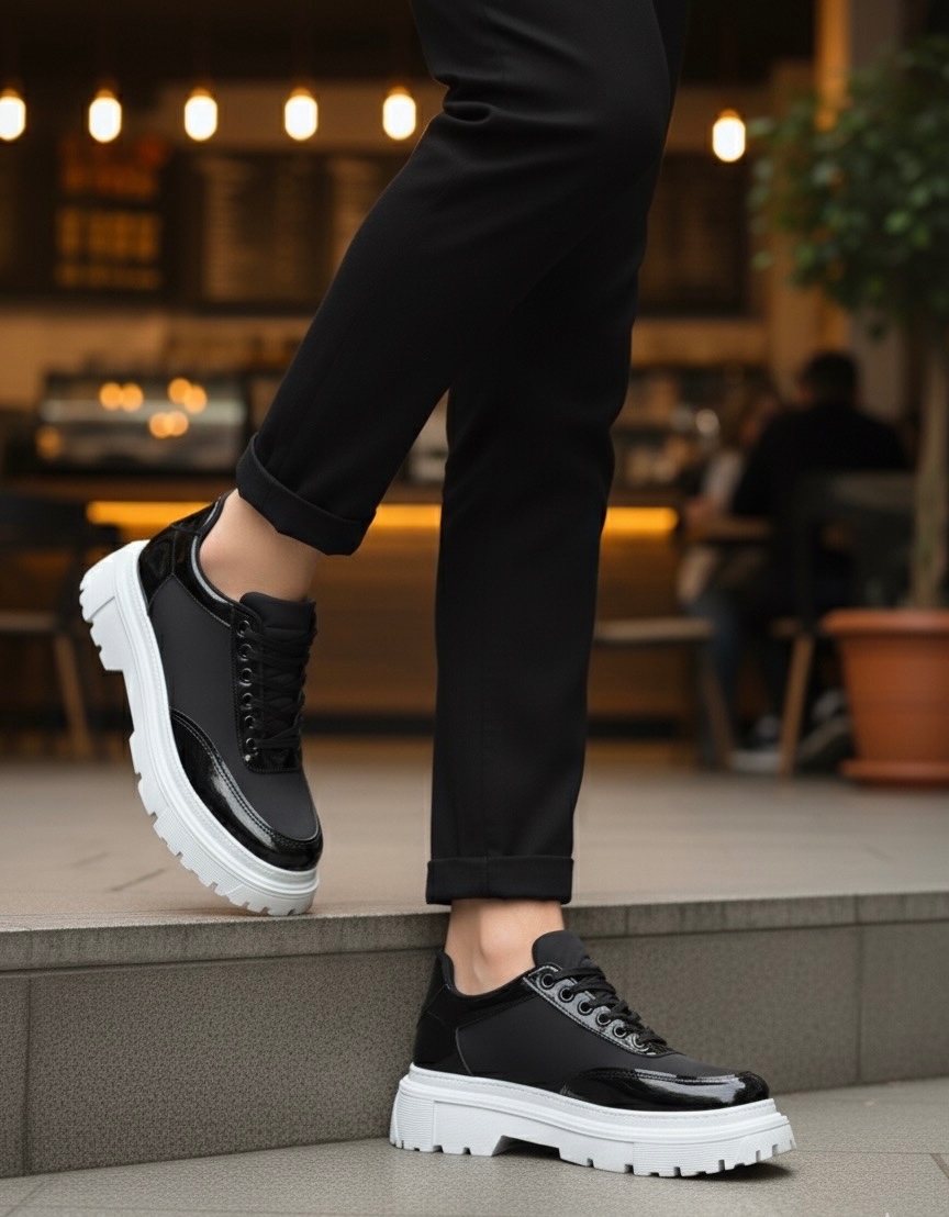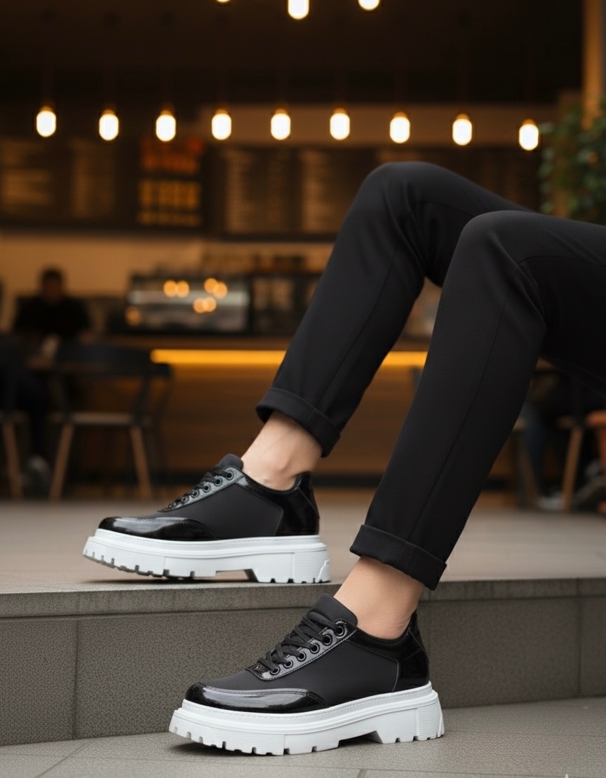 MirgeShoes Siyah Bağcıklı Rugan Erkek Ayakkabı Paraşüt Detaylı Yüksek BYZ Taban MRG010602561