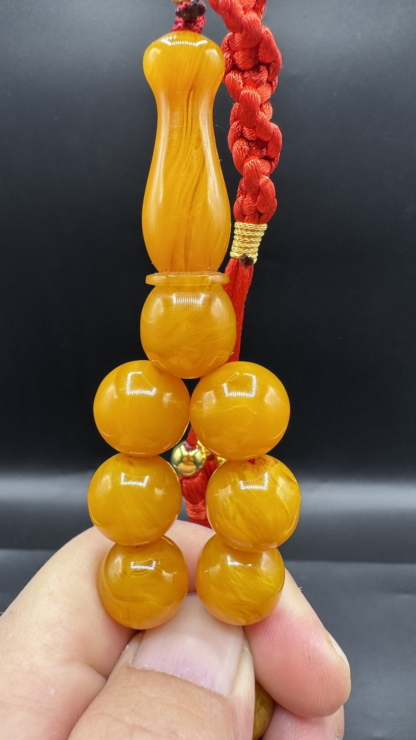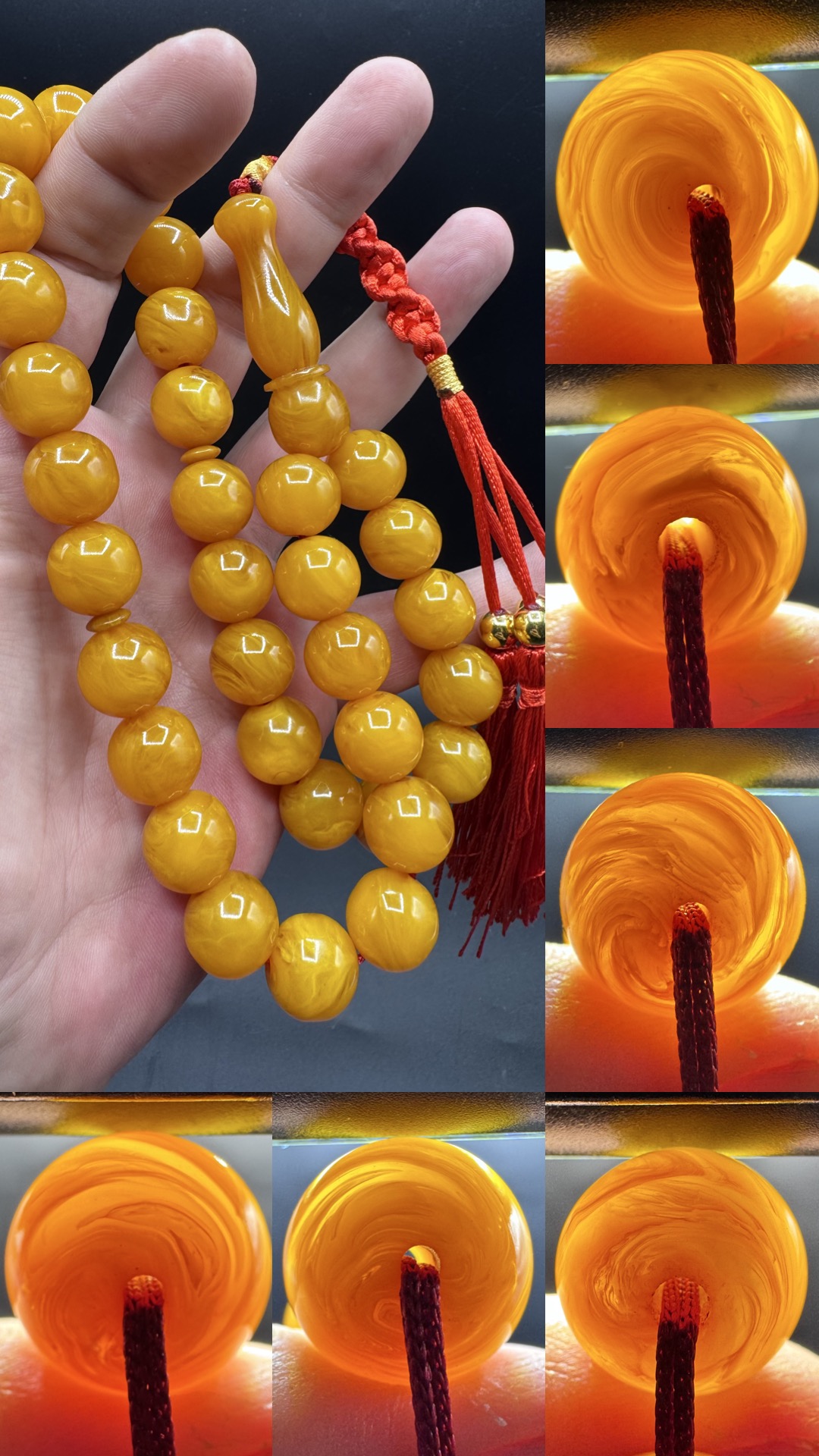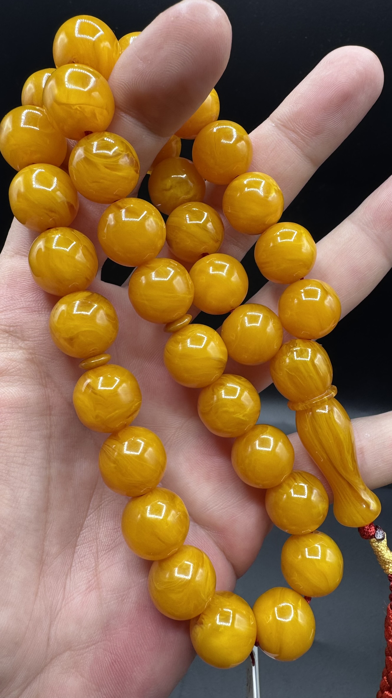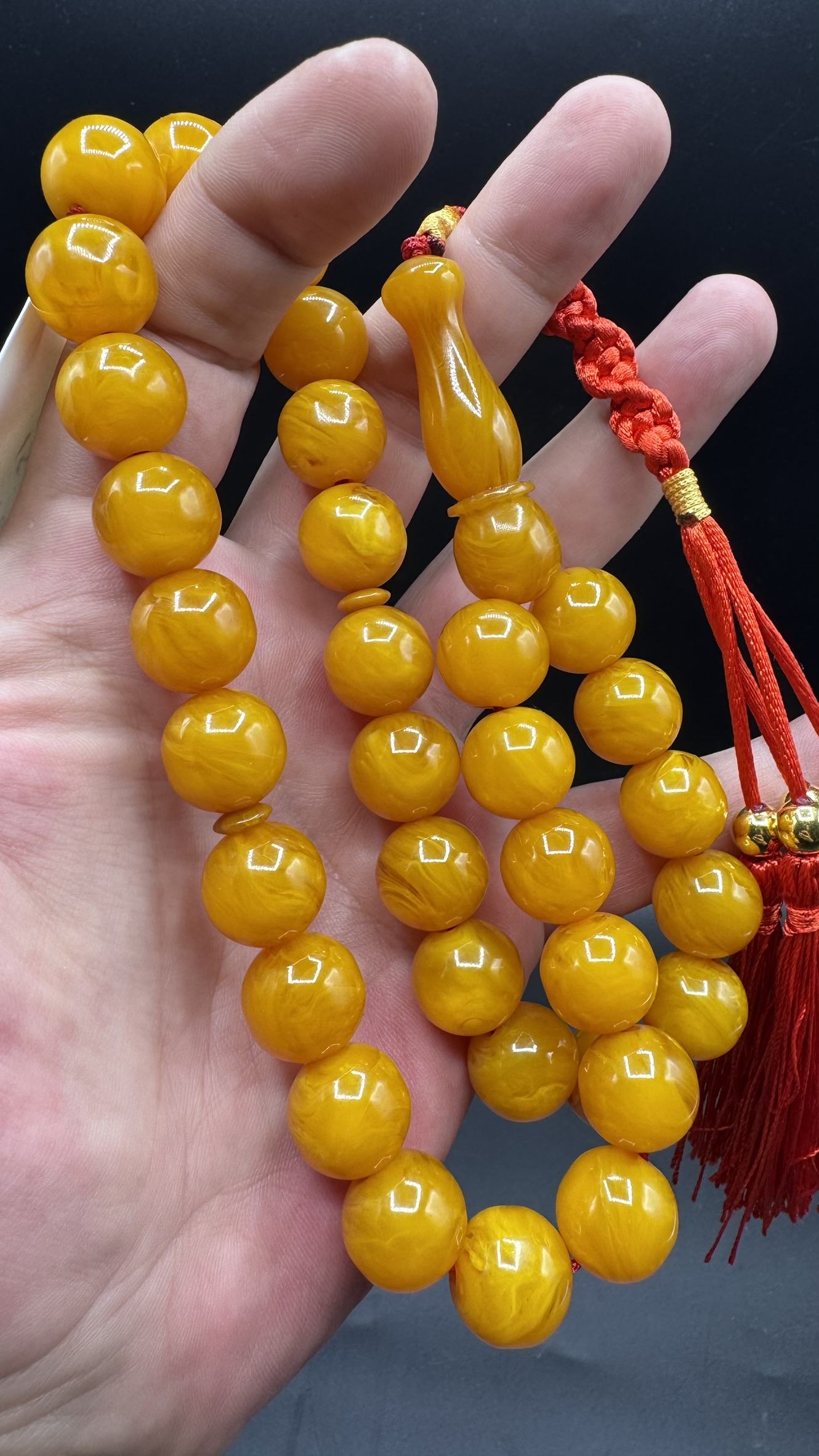 • Tespihimiz iç hare yapısı olarak hamur döküm kalitesi olarak Osmanlı sıkmadan ayırt edemeyeceğiniz dokuda ve güzelliktedir. Hamuru sert çıtır çıtırdır kesinlikle boya yoktur. hare yapısı bu şekilde firfirik veya rüzgargülü yapısında en son Osmanlı döneminde dökülmüş sıkma kehribarlarda mevcuttur. üst düzey koleksiyonluk üründür yıllar geçtikçe değerine değer katacak güzelliktedir.