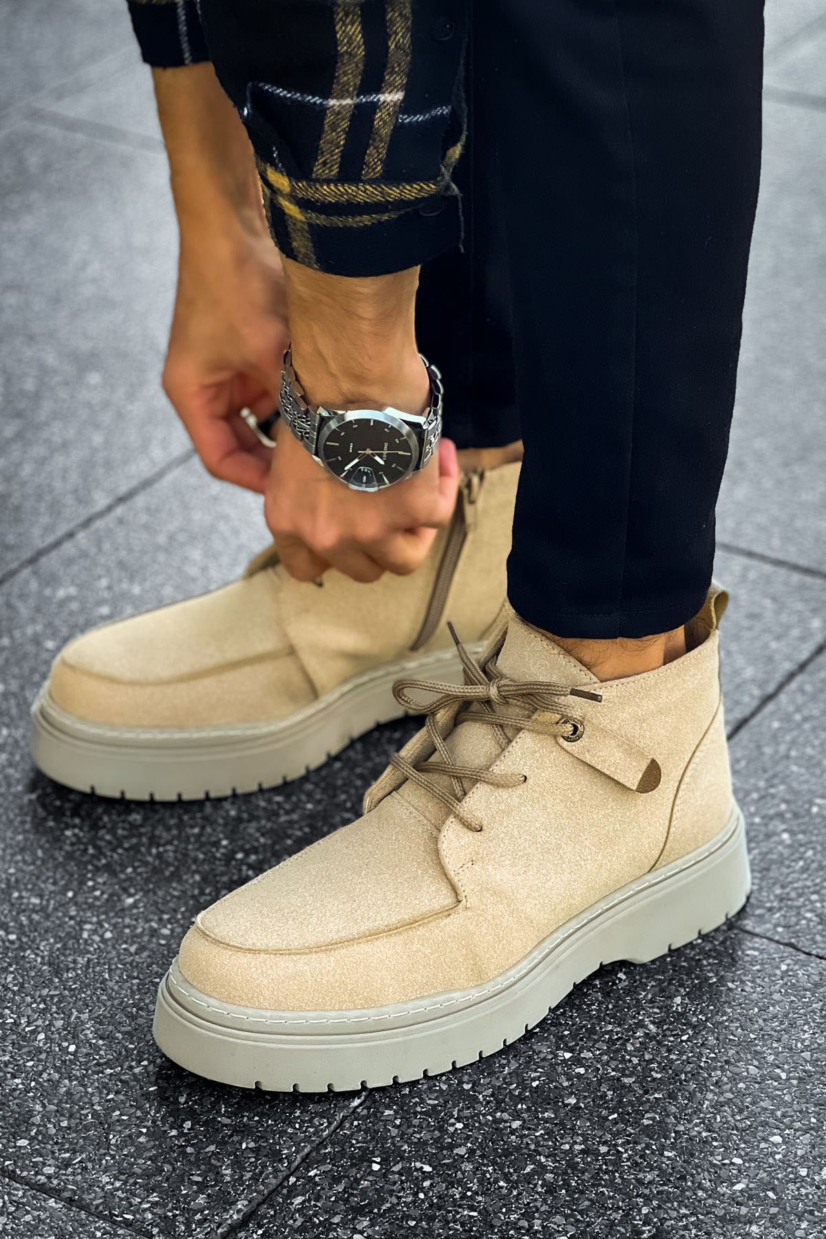 • MirgeShoes Kum Bağcıklı Fermuarlı Erkek Yarım Bilek Bot Kalın KREM Taban MRG01062531