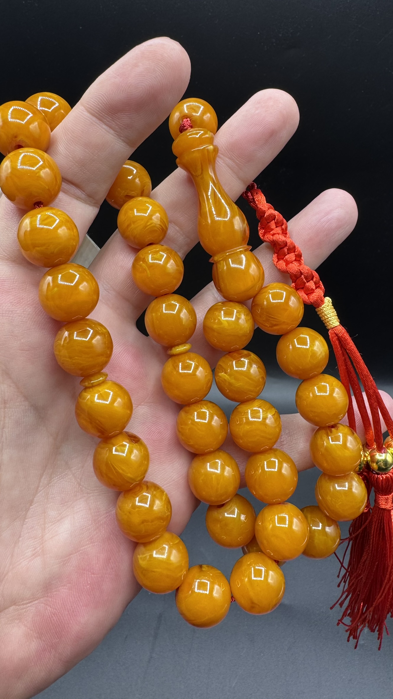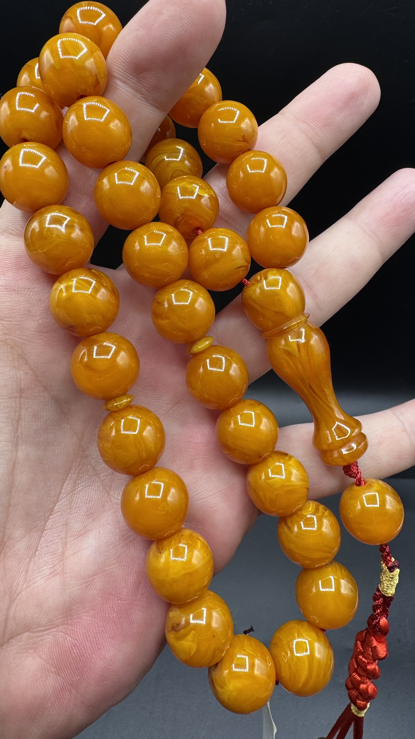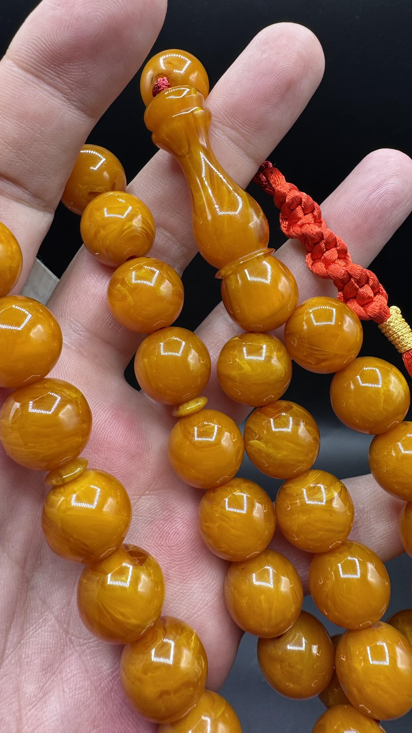 • Tespihimiz iç hare yapısı olarak hamur döküm kalitesi olarak Osmanlı sıkmadan ayırt edemeyeceğiniz dokuda ve güzelliktedir. Hamuru sert çıtır çıtırdır kesinlikle boya yoktur. hare yapısı bu şekilde firfirik veya rüzgargülü yapısında en son Osmanlı döneminde dökülmüş sıkma kehribarlarda mevcuttur. üst düzey koleksiyonluk üründür yıllar geçtikçe değerine değer katacak güzelliktedir.
