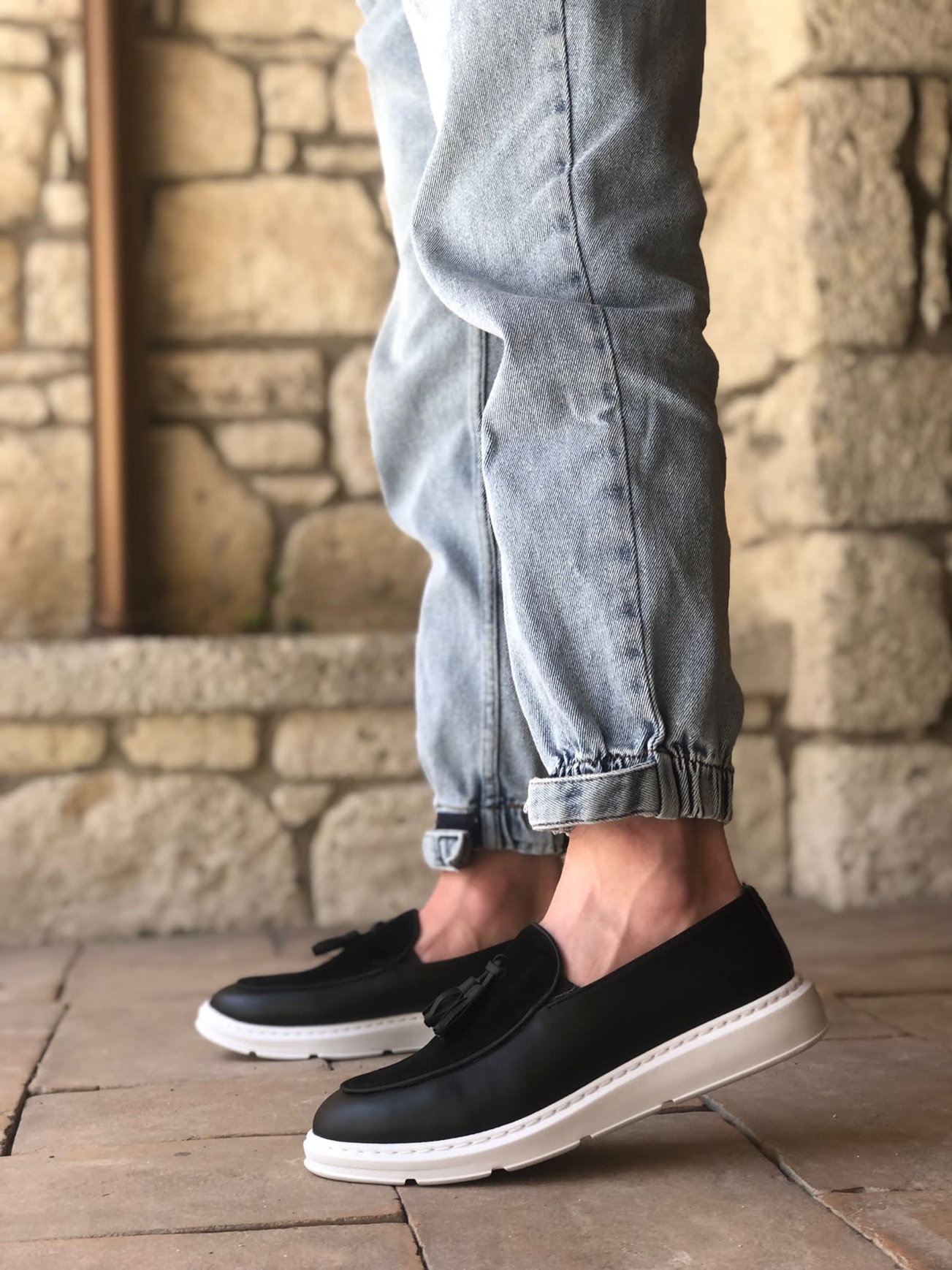 MirgeShoes Siyah Bağcıksız Püsküllü Erkek Loafer Ayakkabı Cilt-Süet Detaylı Yüksek BYZ Taban MRG01060002323
