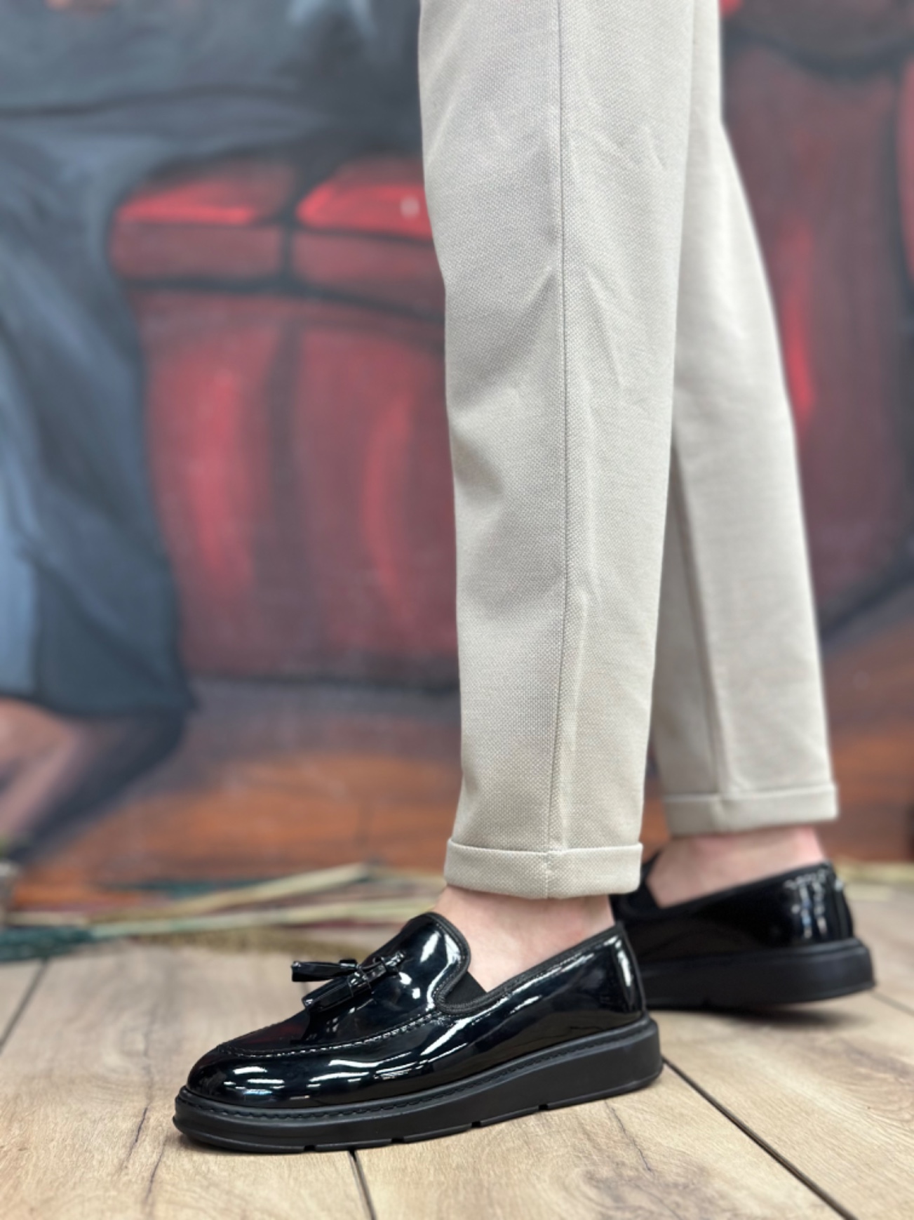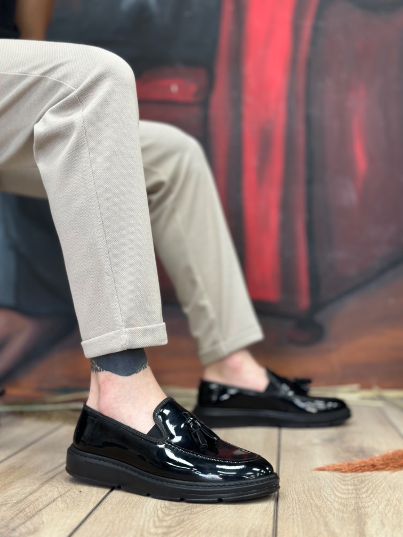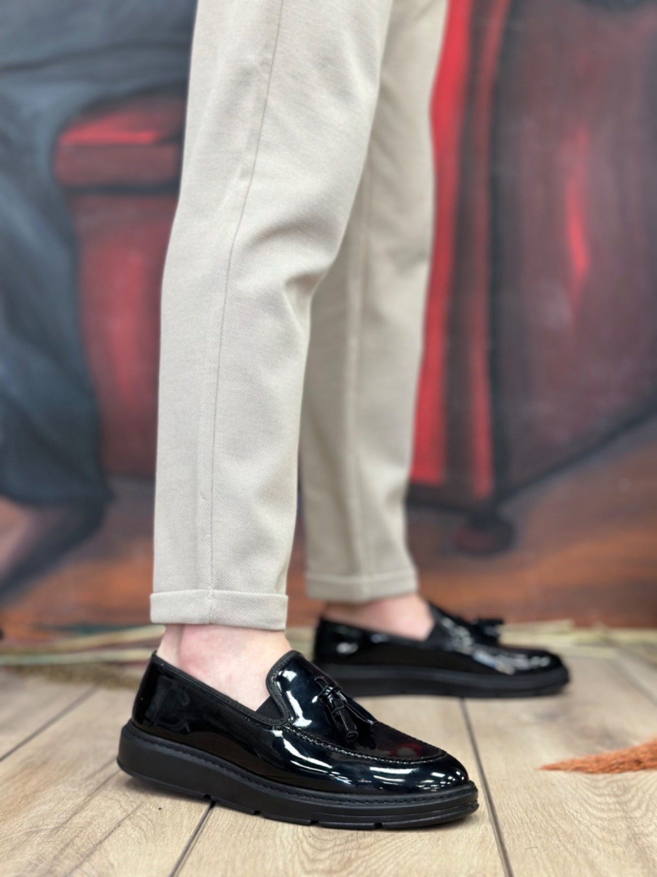• MirgeShoes Siyah Bağcıksız Püsküllü Erkek Loafer Ayakkabı Rugan Kemerli Yüksek SYH Taban MRG01060002323