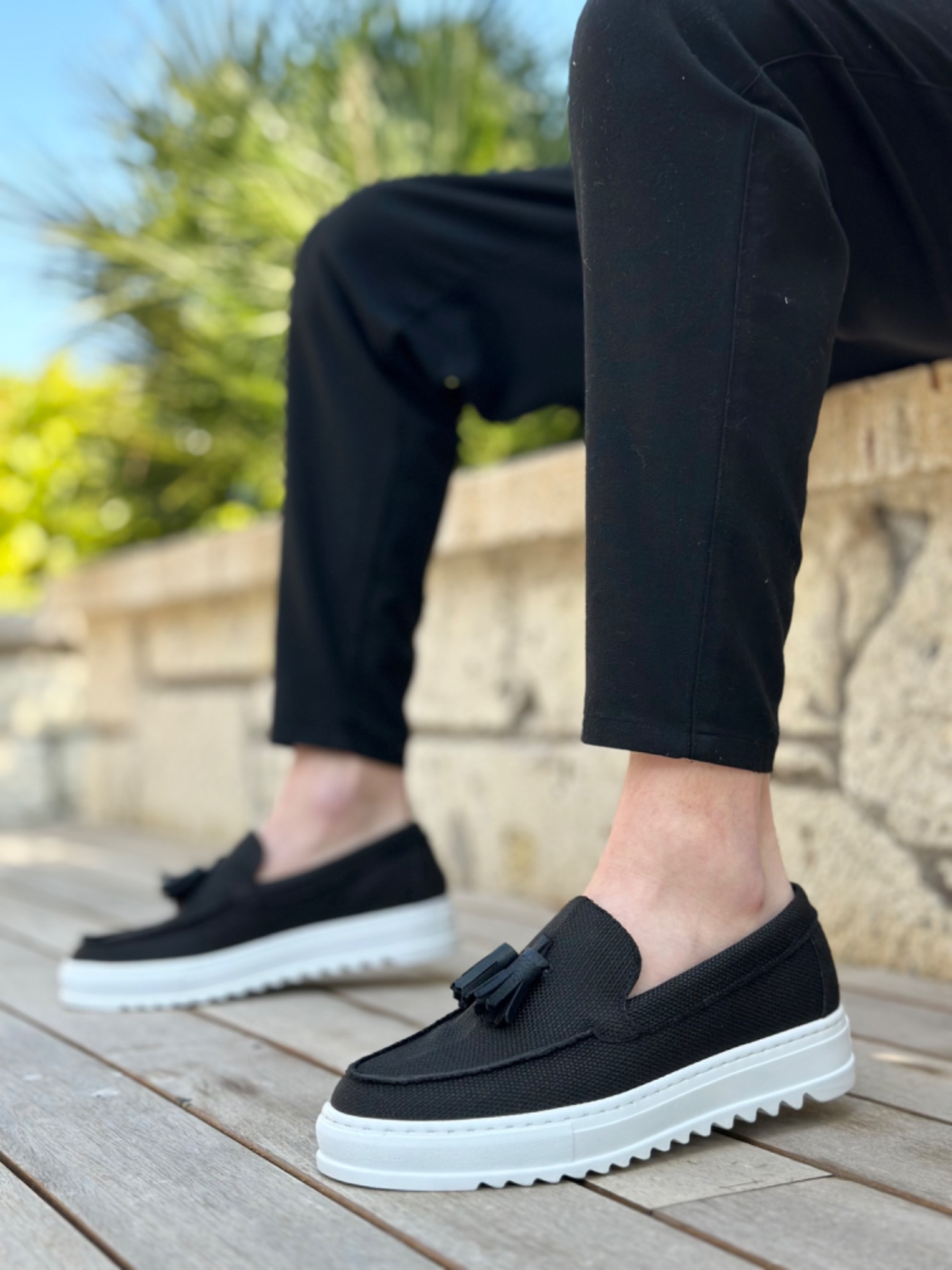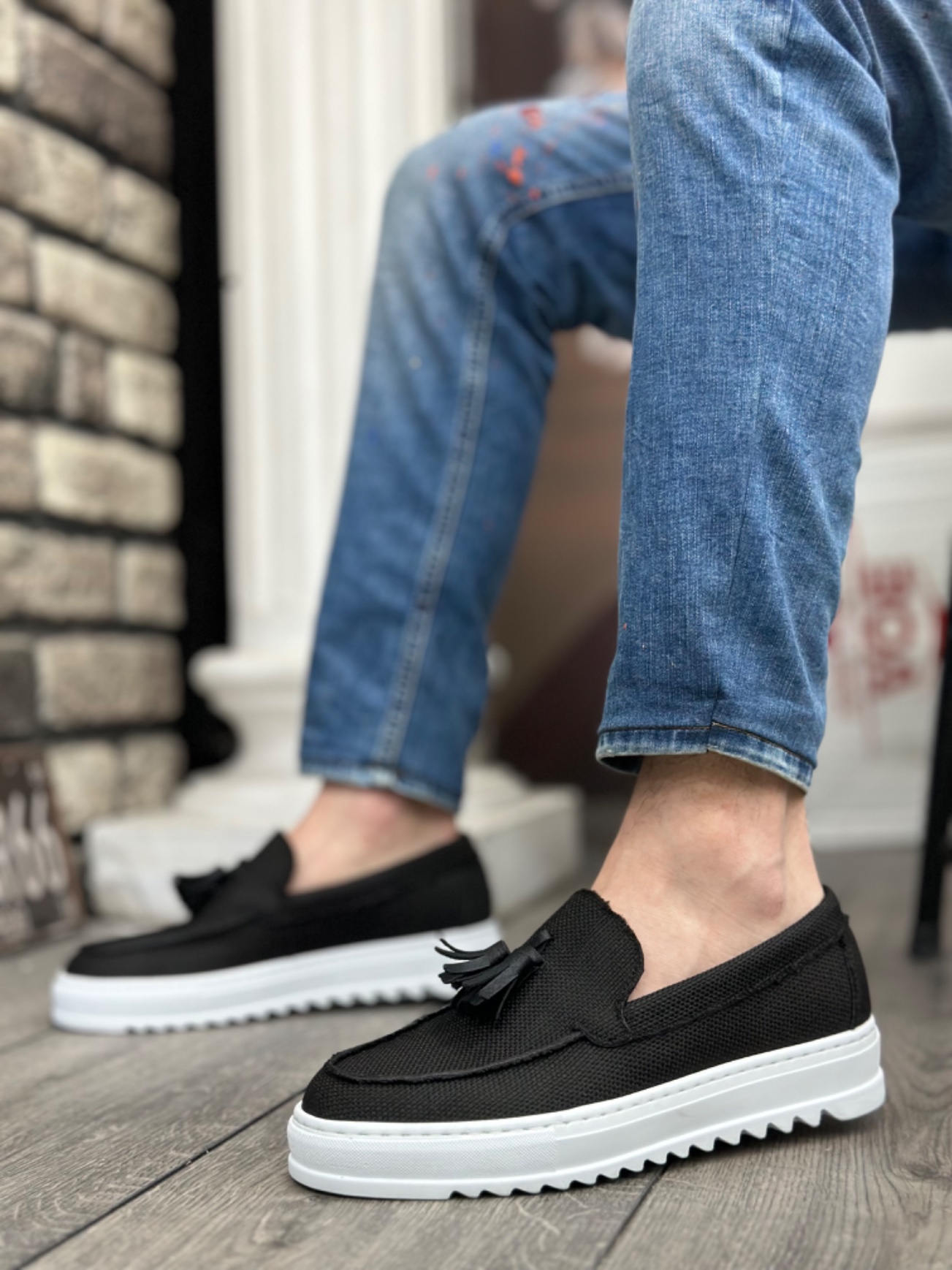 • MirgeShoes Siyah Bağcıksız Püsküllü Erkek Casual Ayakkabı Keten Yüksek BYZ Taban MRG010602472