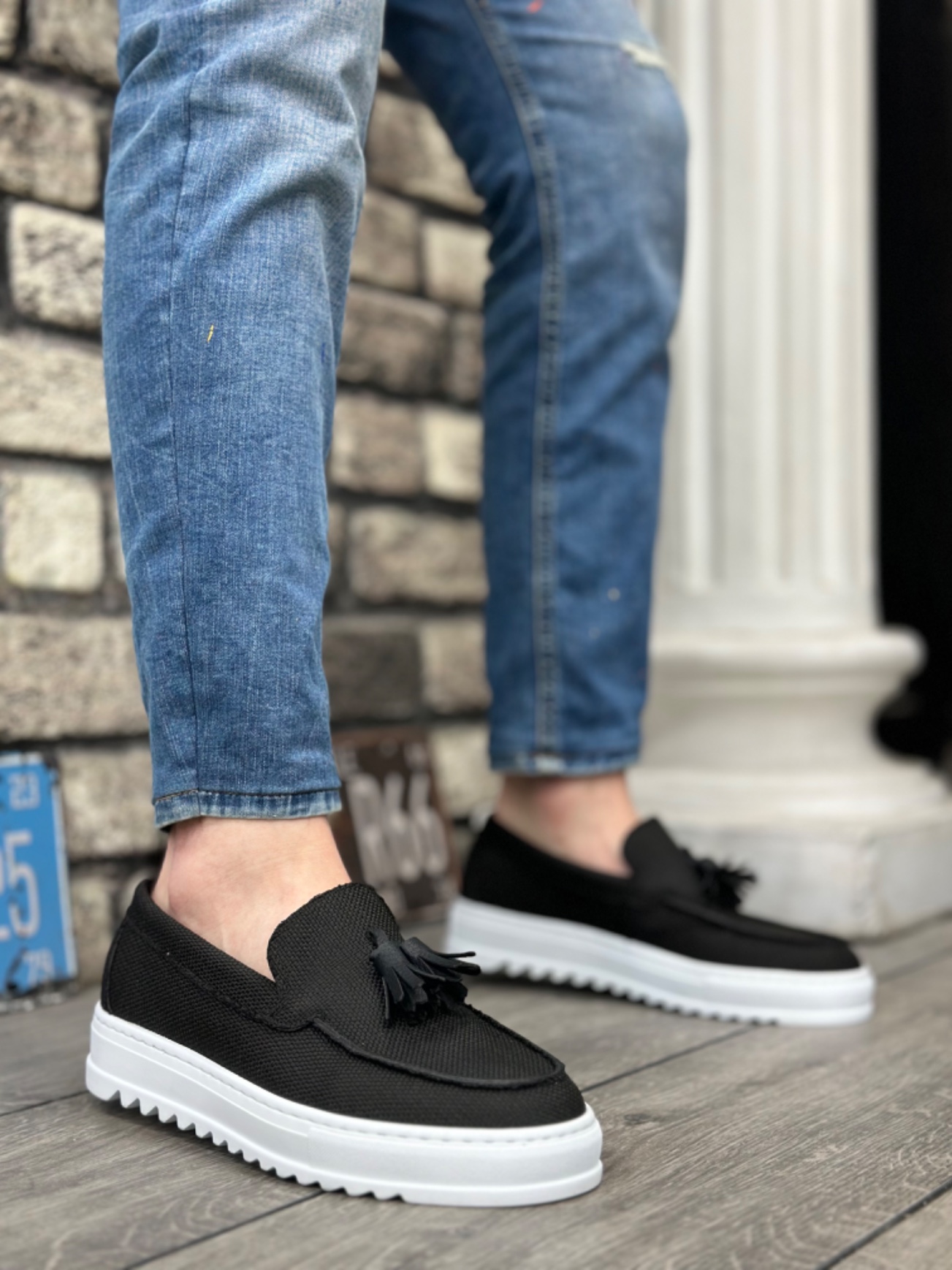 MirgeShoes Siyah Bağcıksız Püsküllü Erkek Casual Ayakkabı Keten Yüksek BYZ Taban MRG010602472