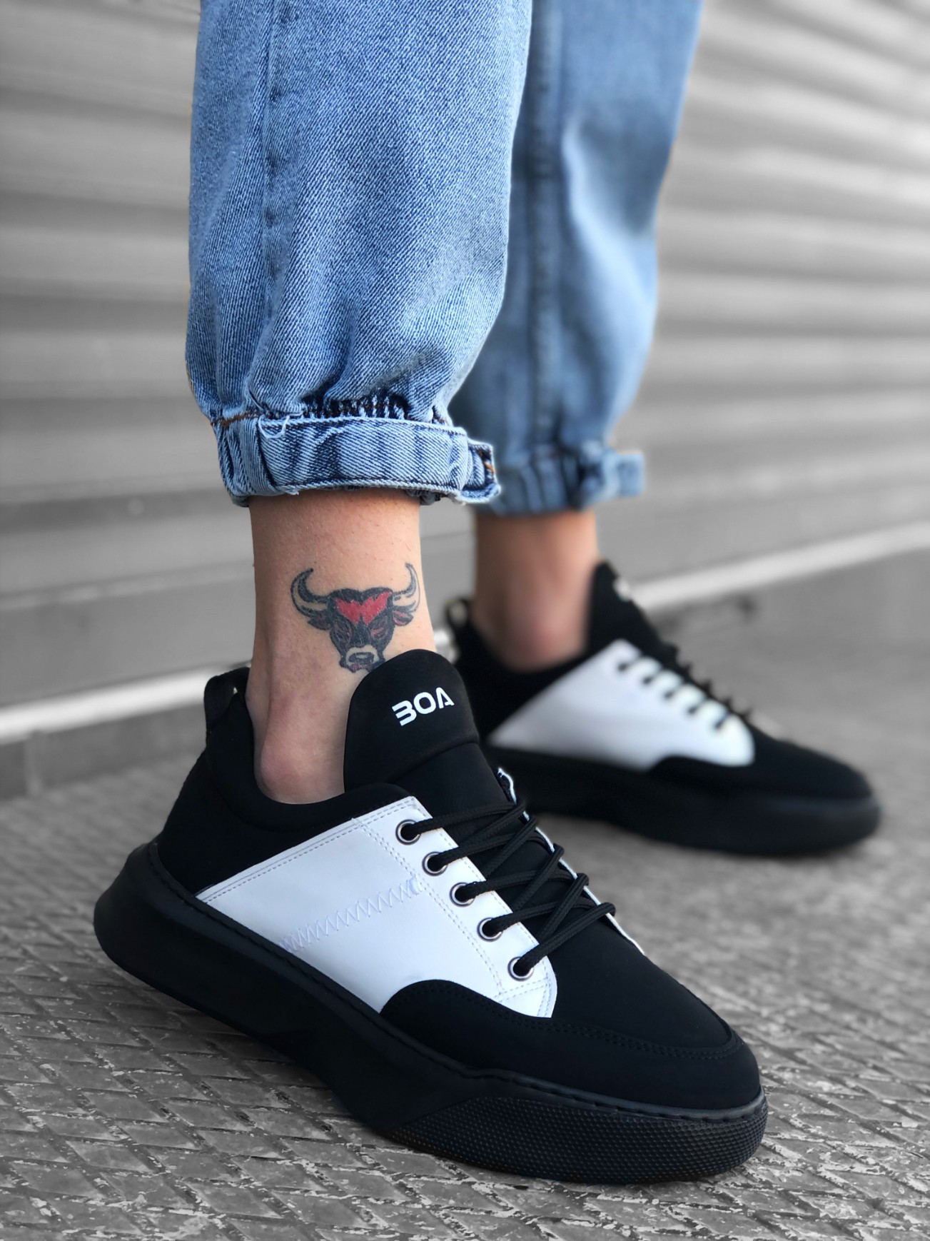 MirgeShoes Siyah-Beyaz Bağcıklı Erkek Spor Ayakkabı Yüksek SYH Taban MRG010602481