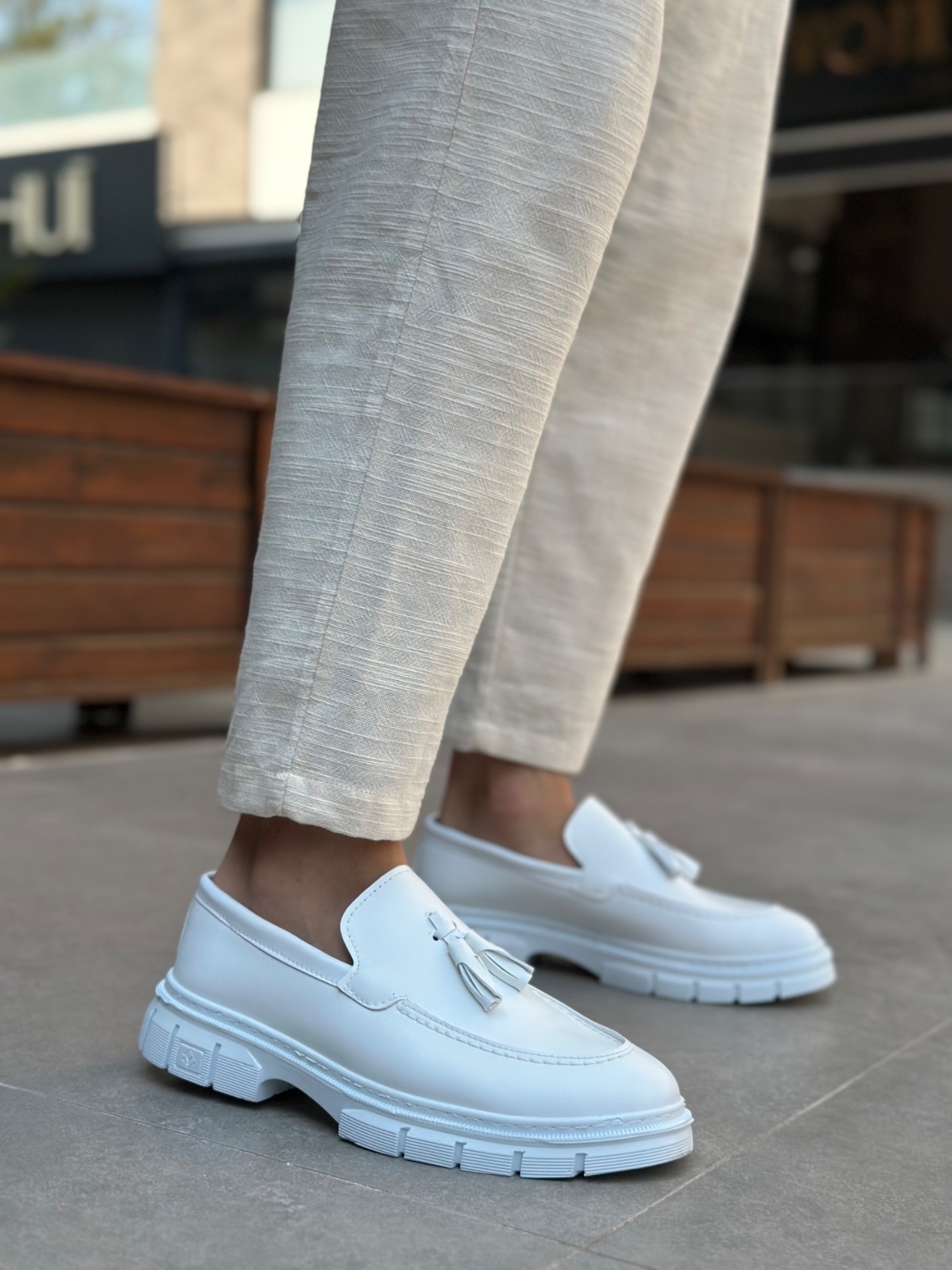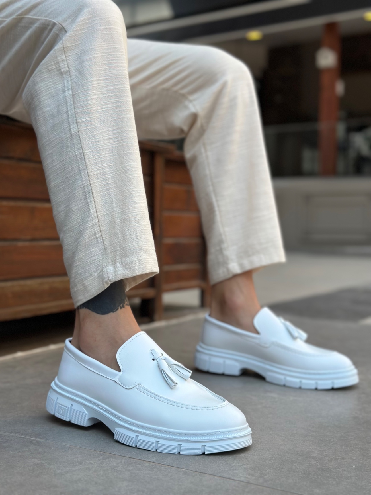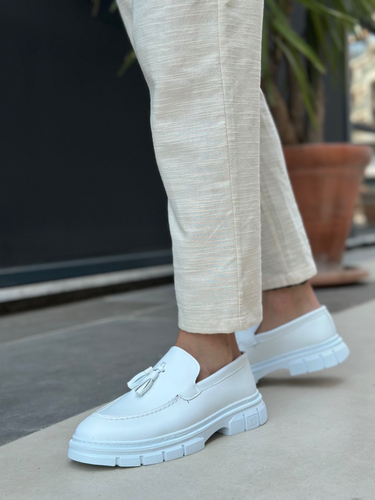 MirgeShoes Beyaz Püsküllü Erkek Klasik Ayakkabı Parlak Cilt Kalın BYZ Taban MRG010602558