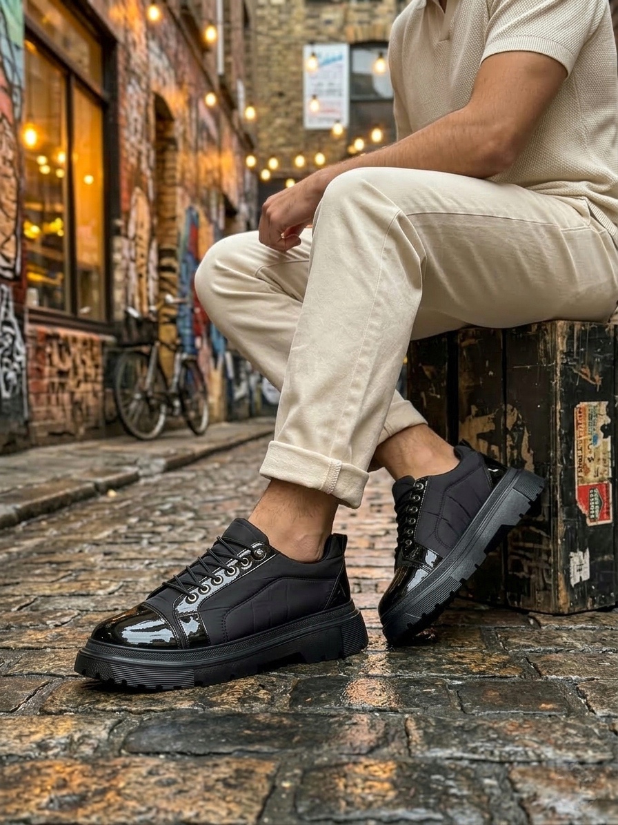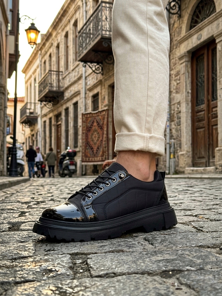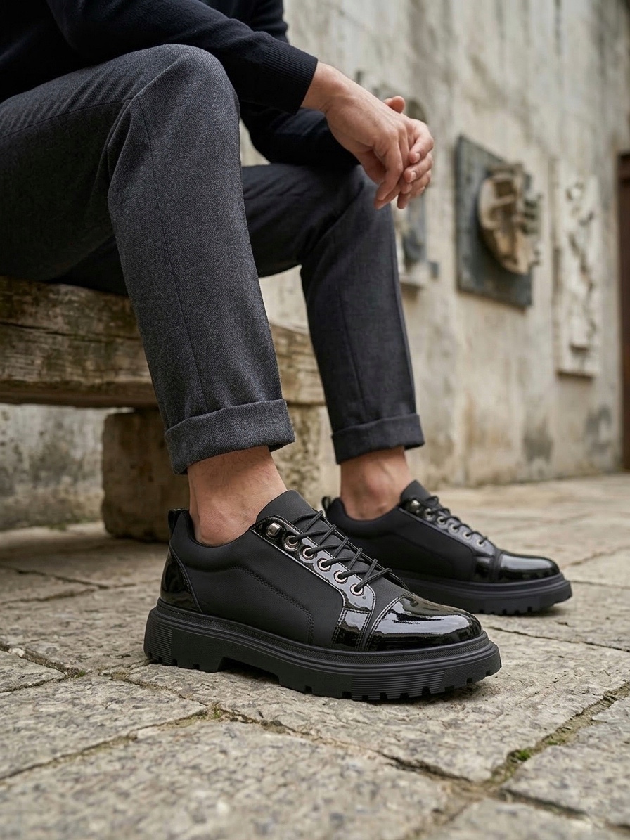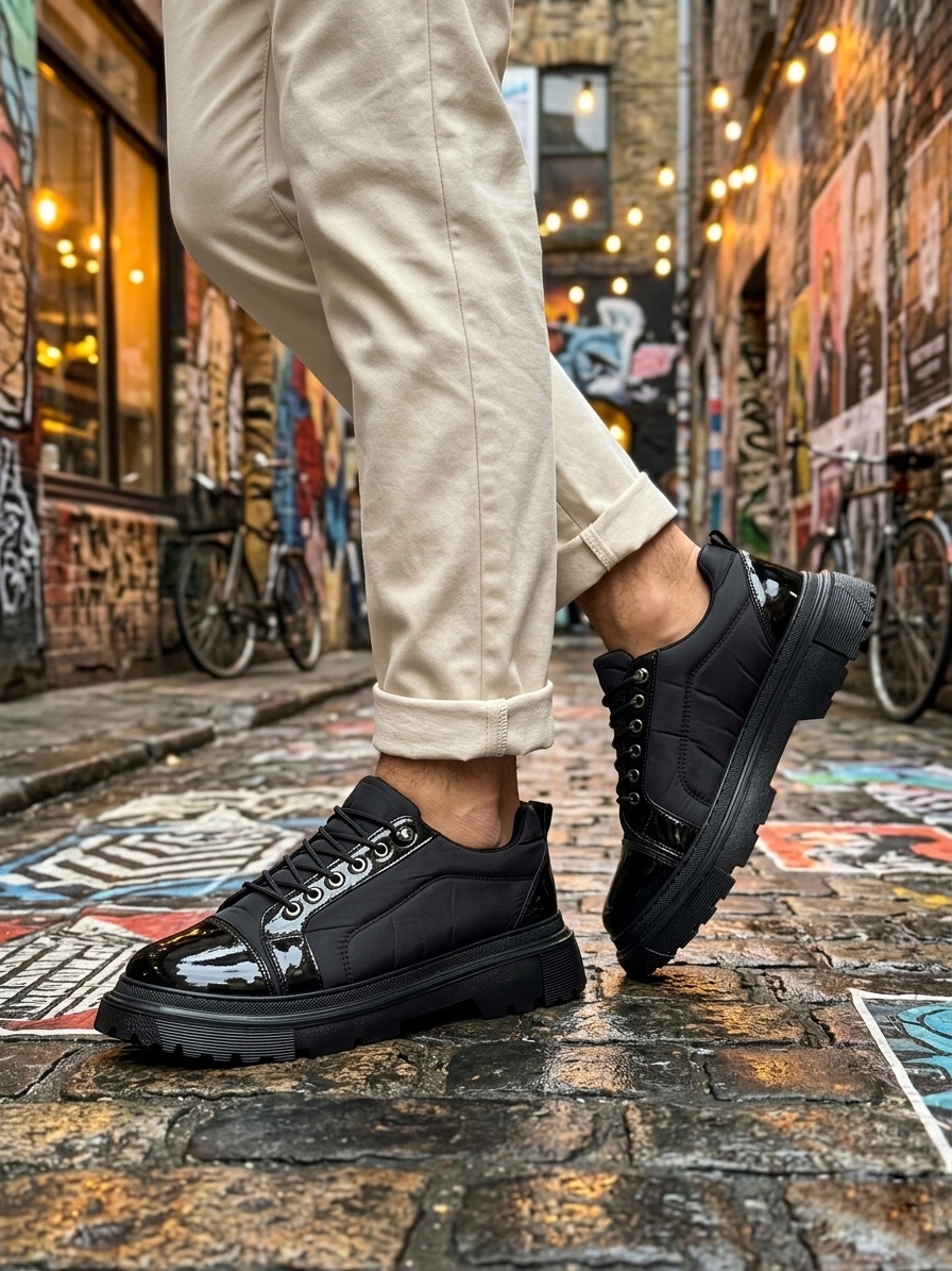 MirgeShoes Siyah Akıllı Lastik Bağcık Erkek Rugan Günlük Ayakkabı Paraşüt Detaylı Yüksek SYH Taban MRG010602563