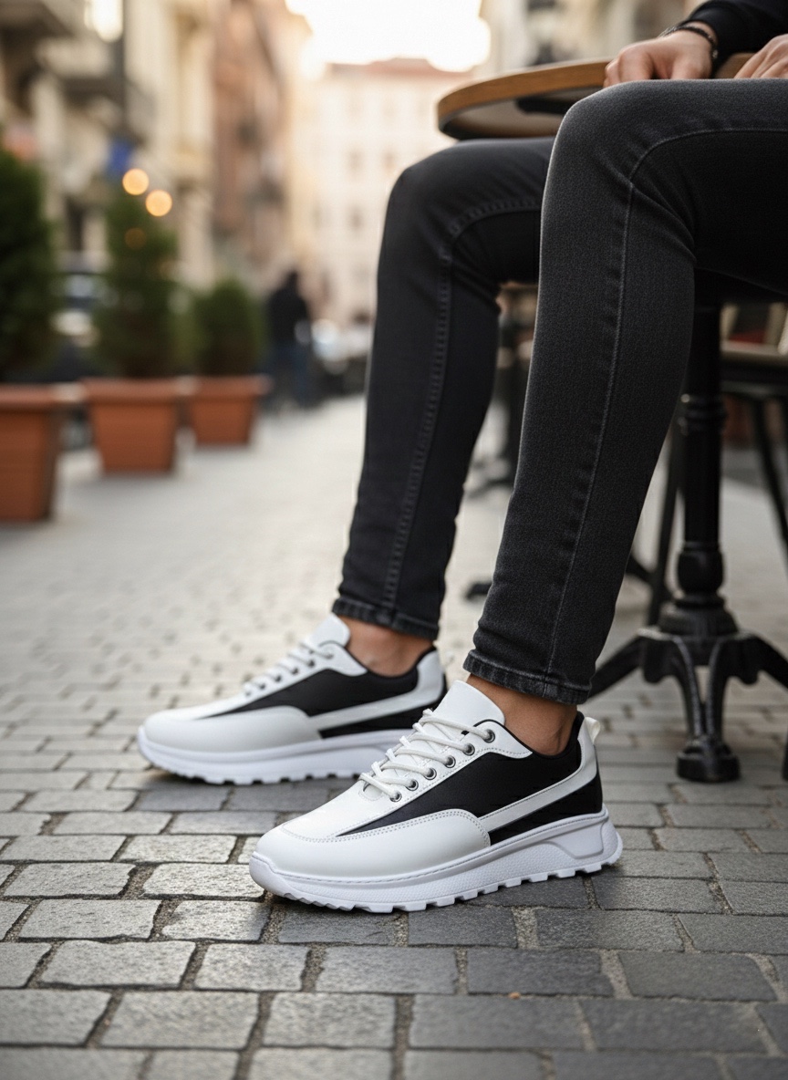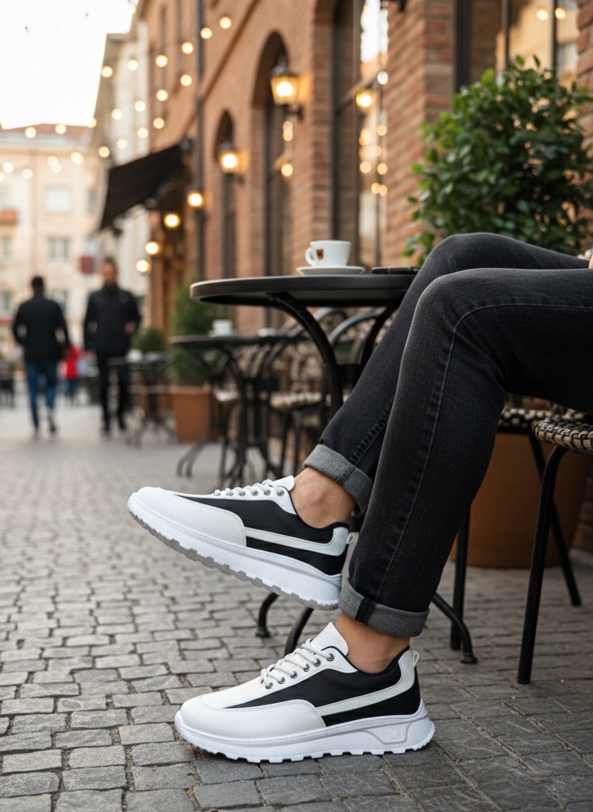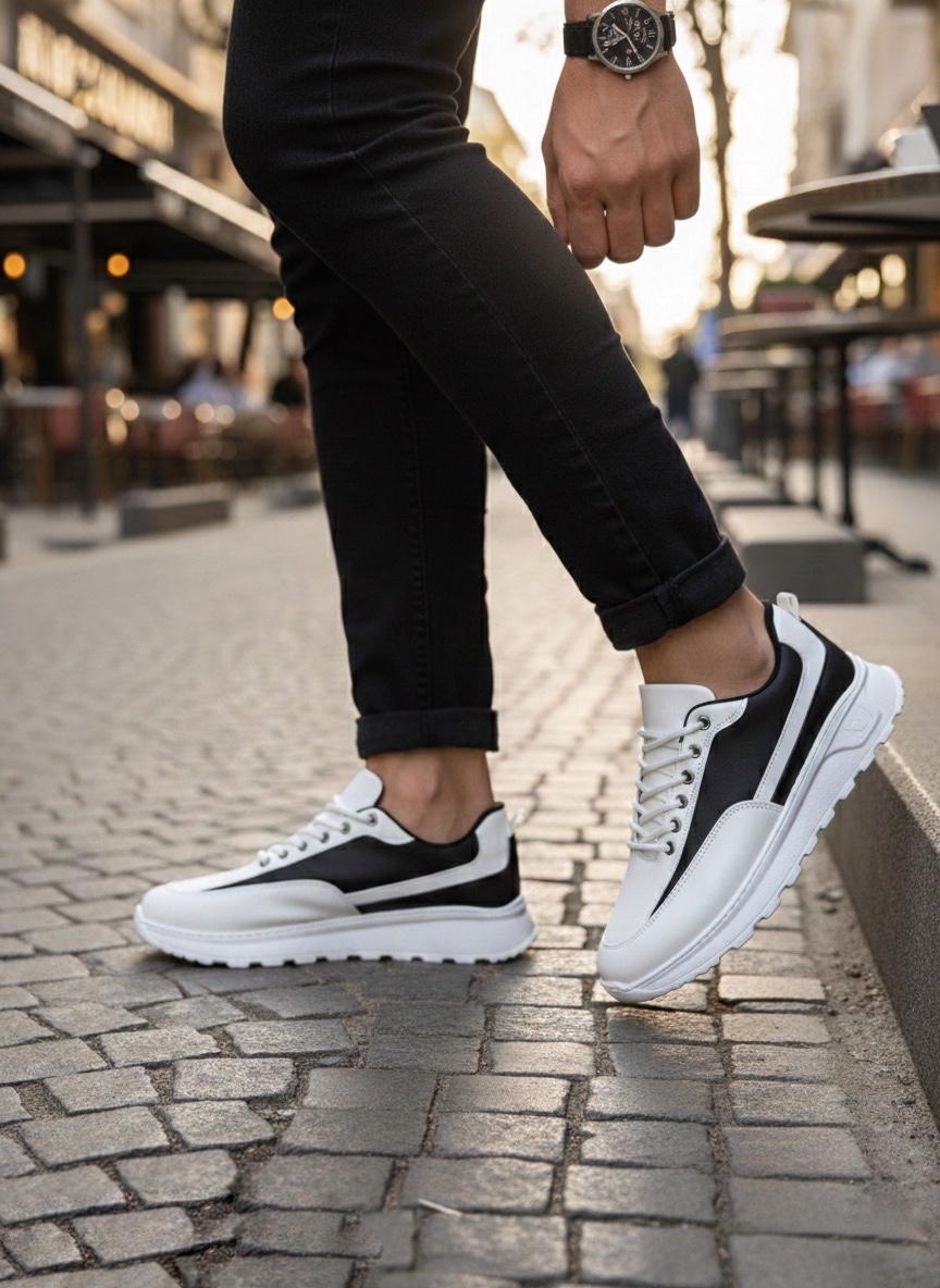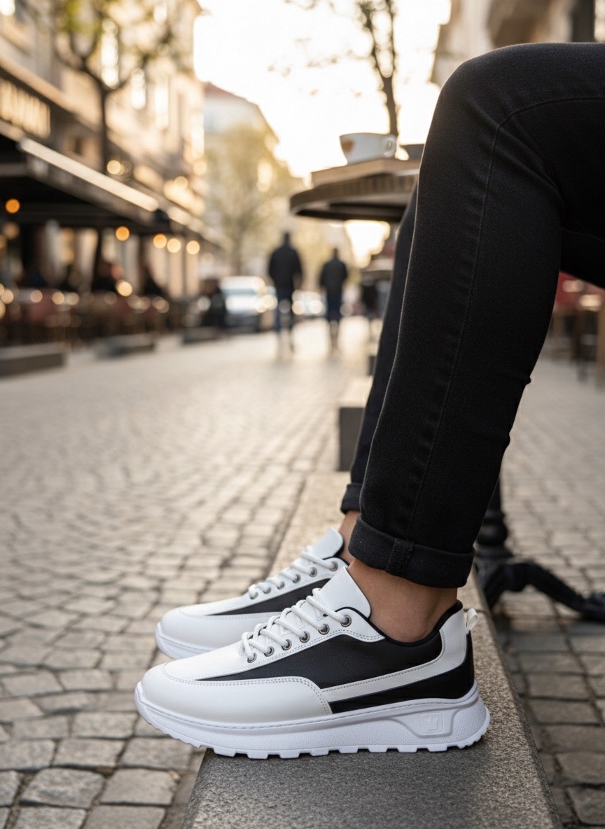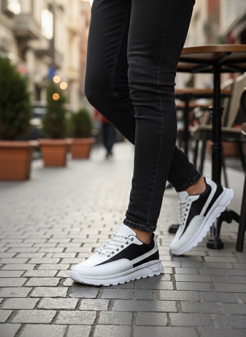 • MirgeShoes Beyaz-Siyah Bağcıklı Erkek Günlük Spor Ayakkabı Tırtıklı Yüksek BYZ Taban MRG010602564