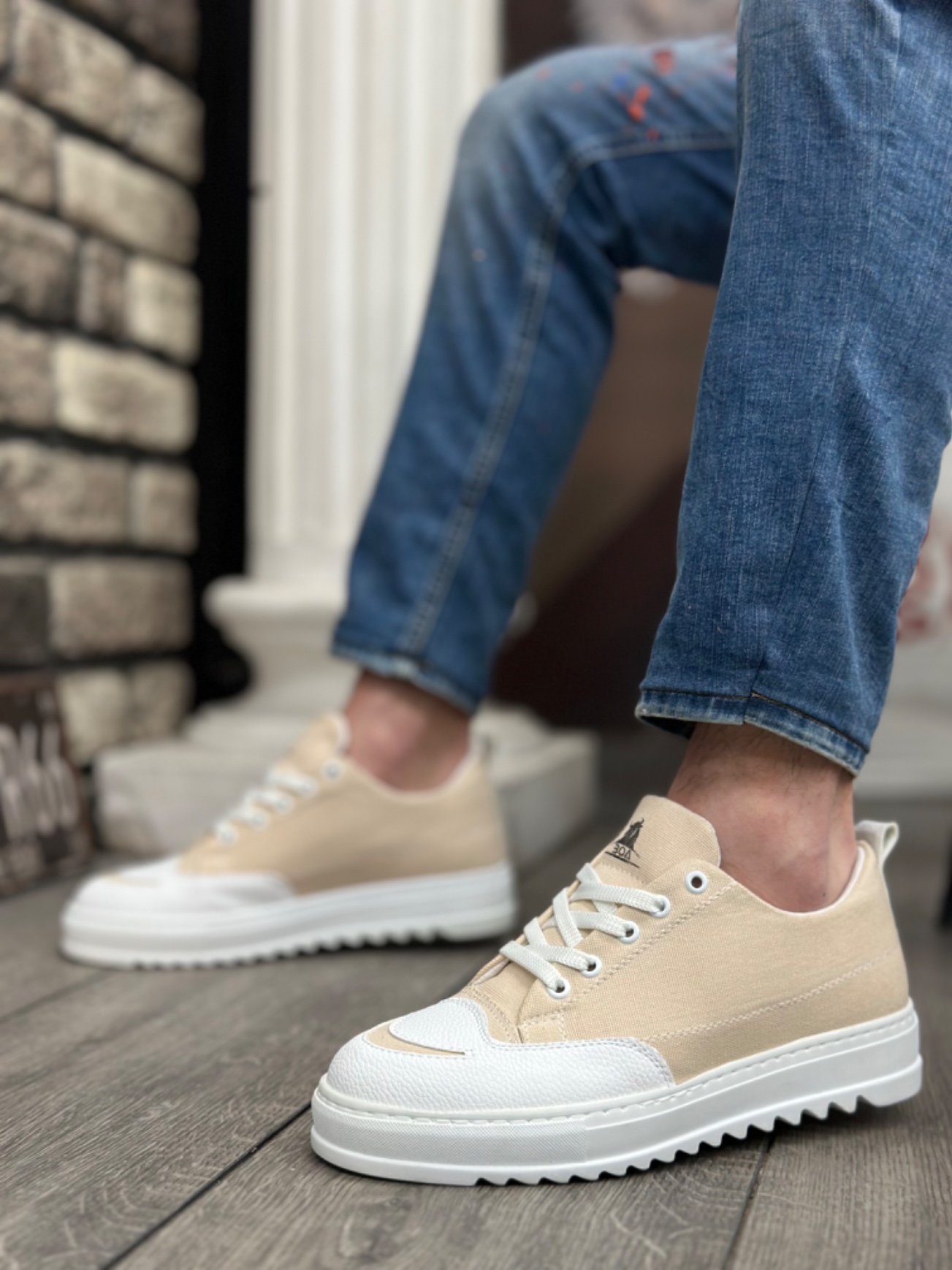 MirgeShoes Krem Bağcıklı Erkek Spor Ayakkabı Keten Tırtıklı Kalın Yüksek BYZ Taban MRG010602646