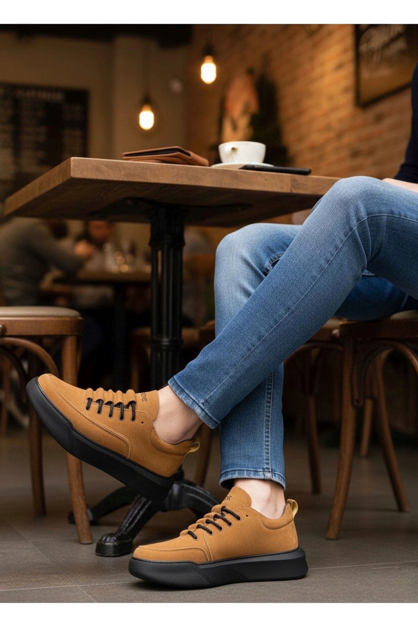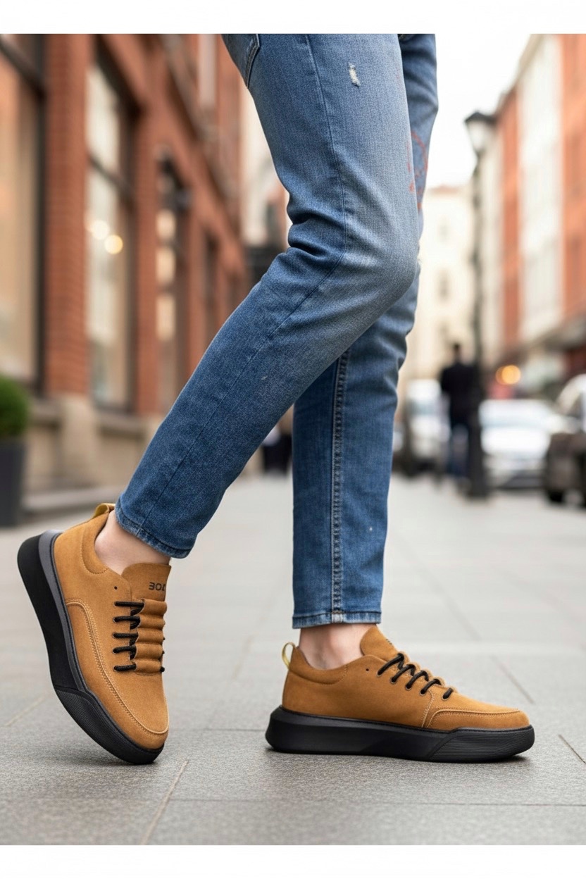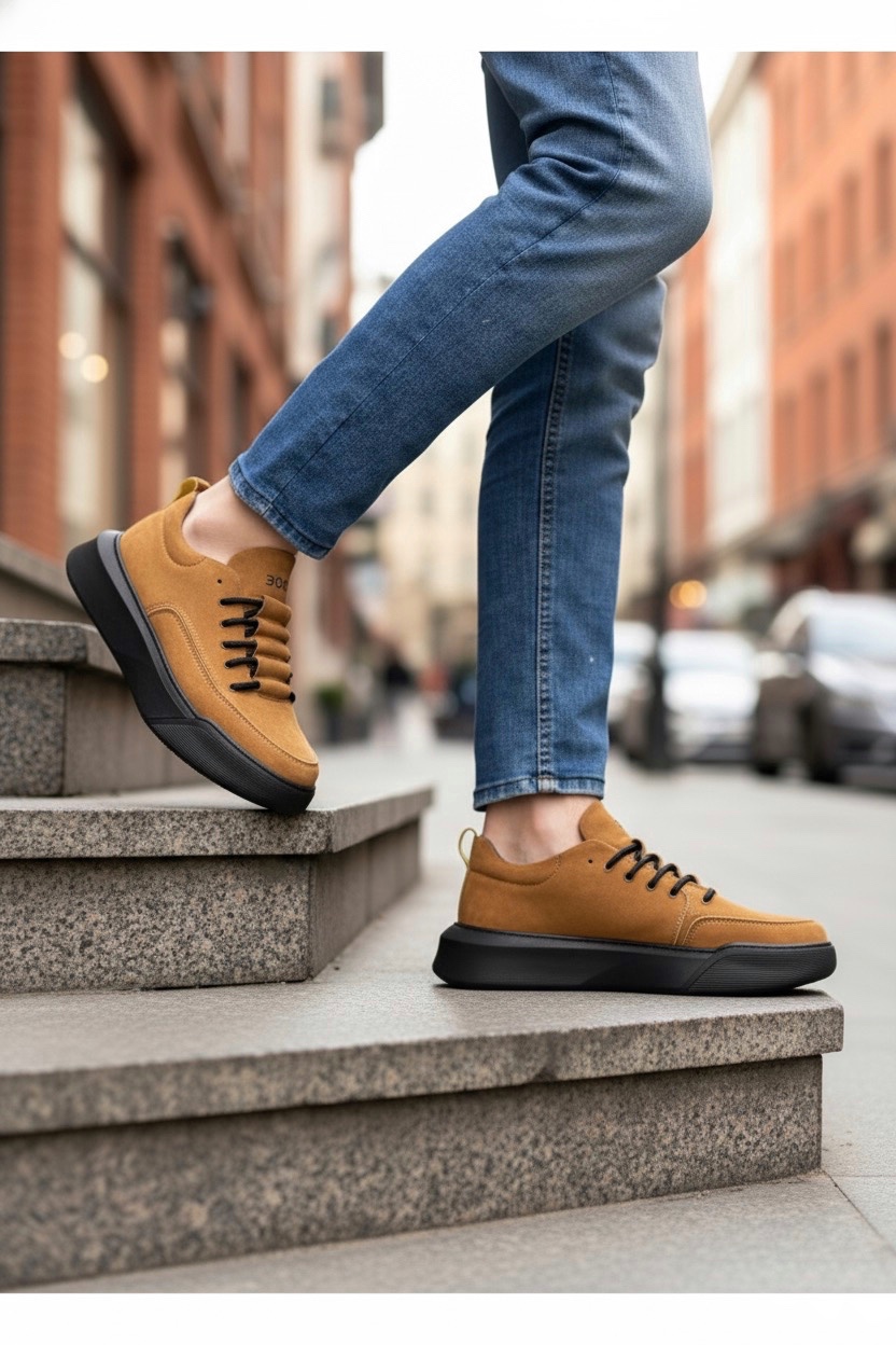 • MirgeShoes Taba Bağcıklı Erkek Spor Ayakkabı Süet Deri Merdiven Desen Yüksek SYH Taban MRG010602650