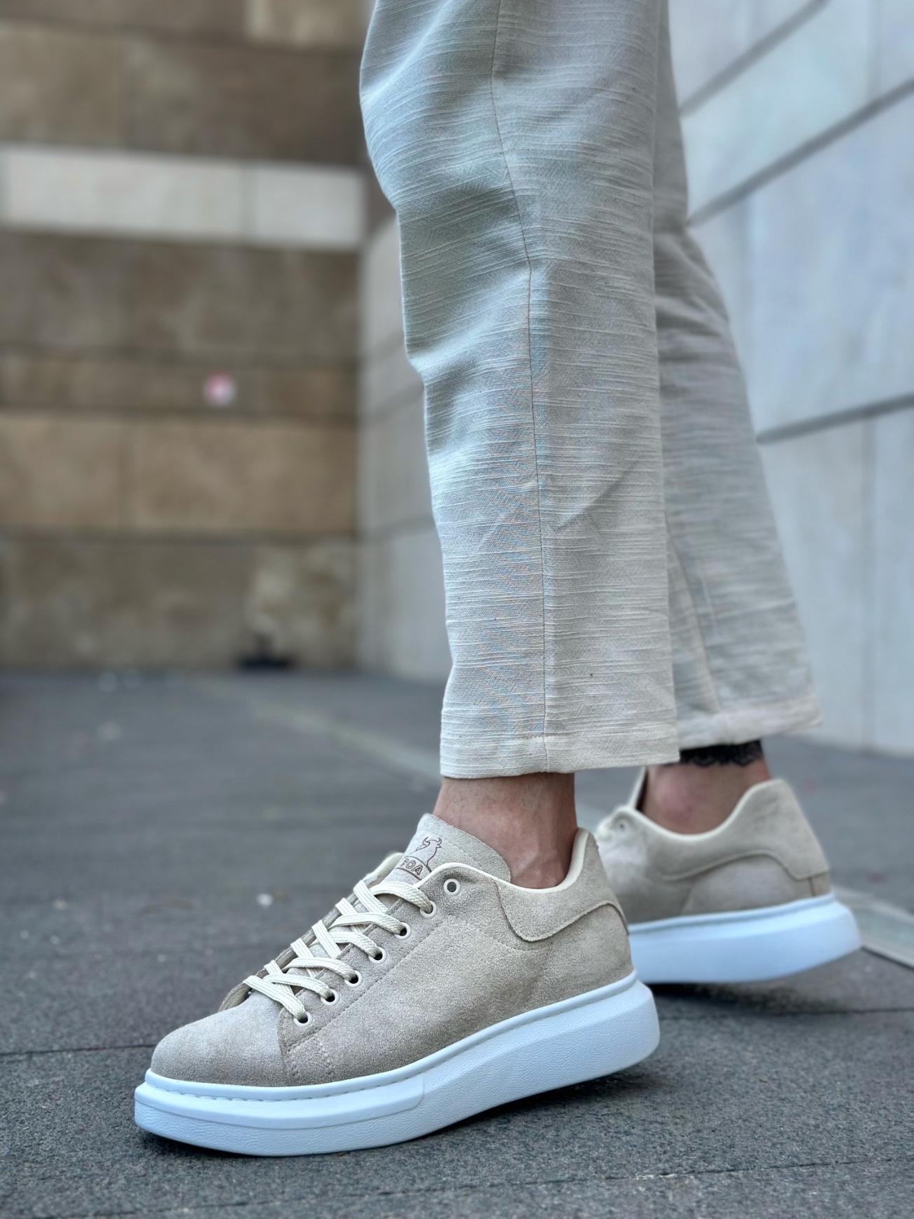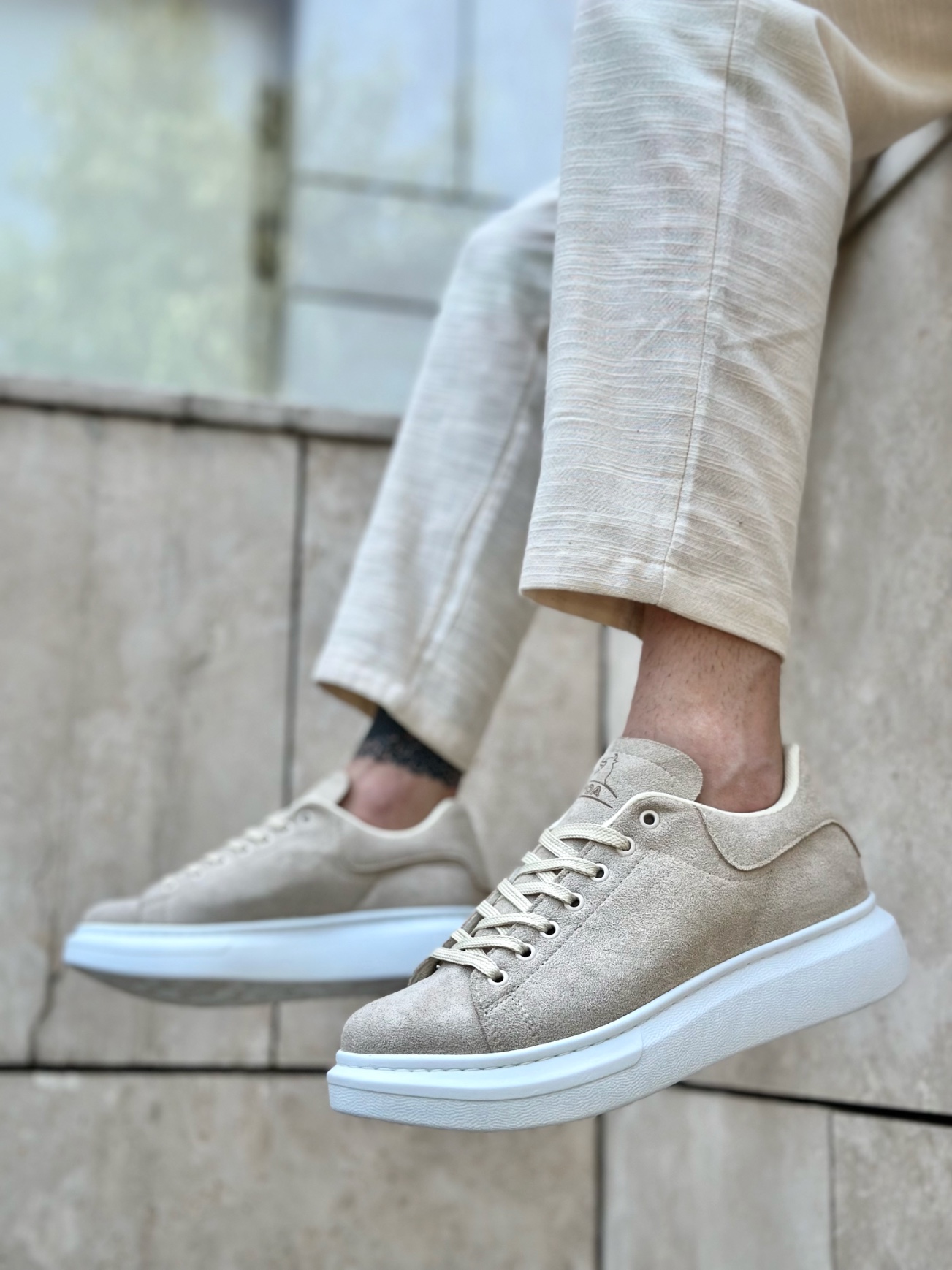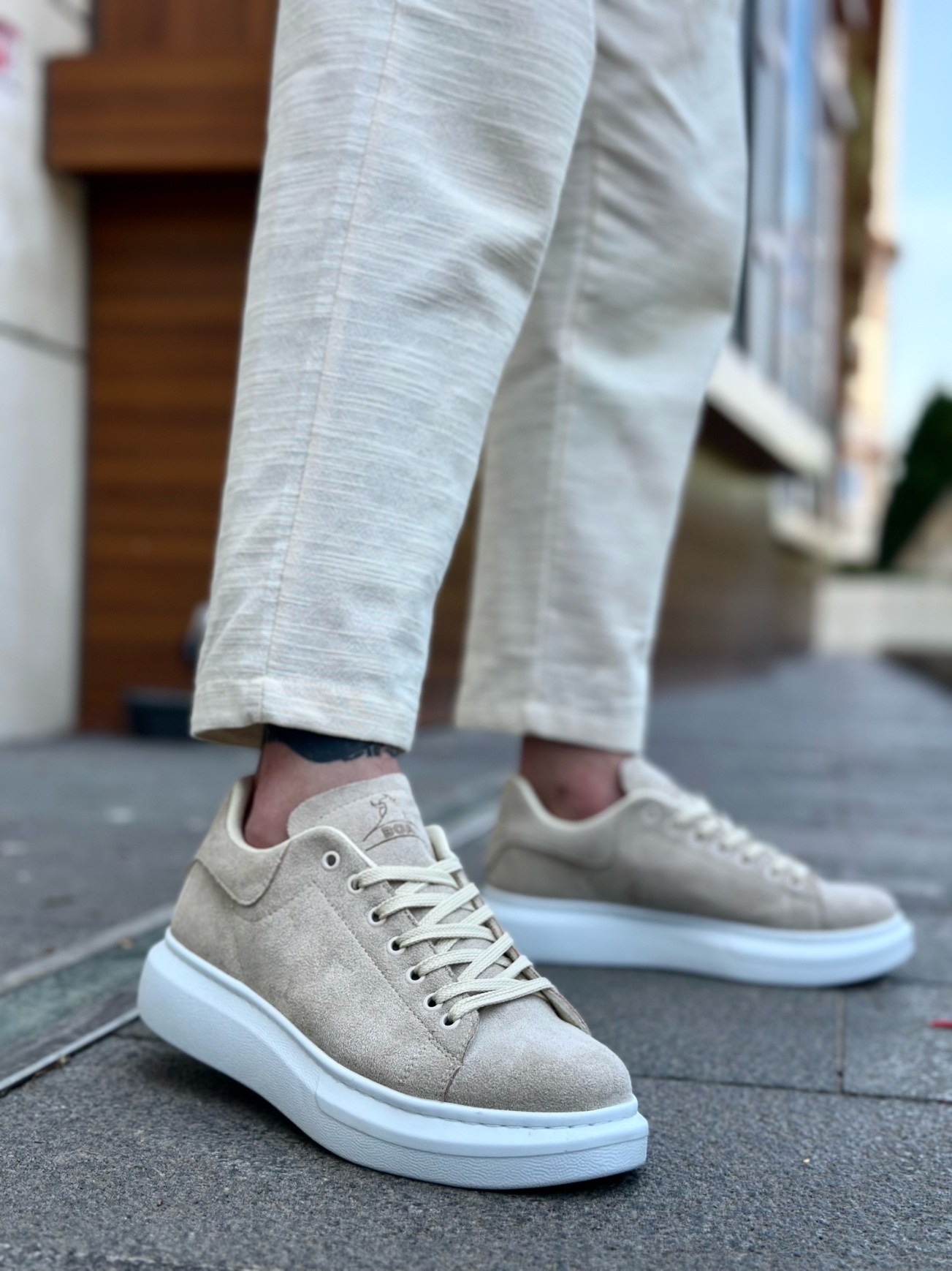 MirgeShoes Krem Bağcıklı Erkek Spor Ayakkabı Süet Deri Kalın Yüksek BYZ Taban MRG010602865