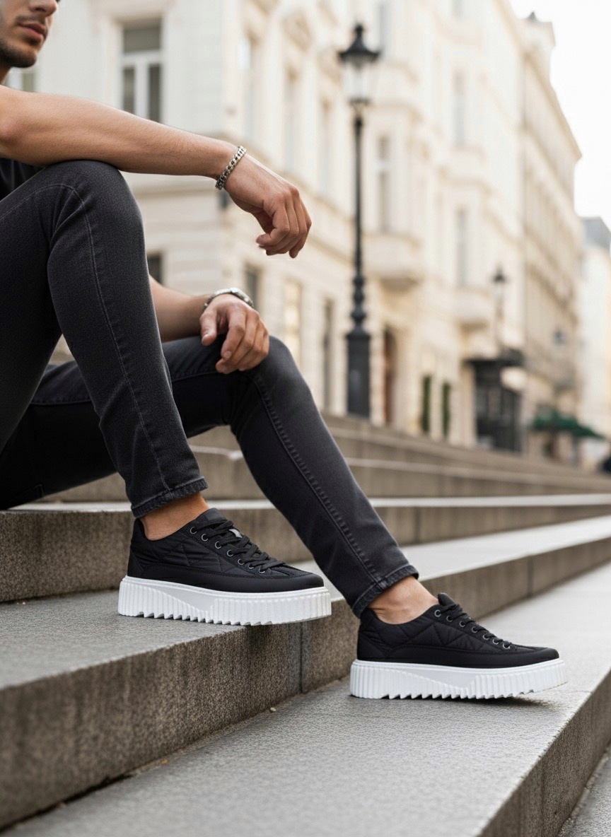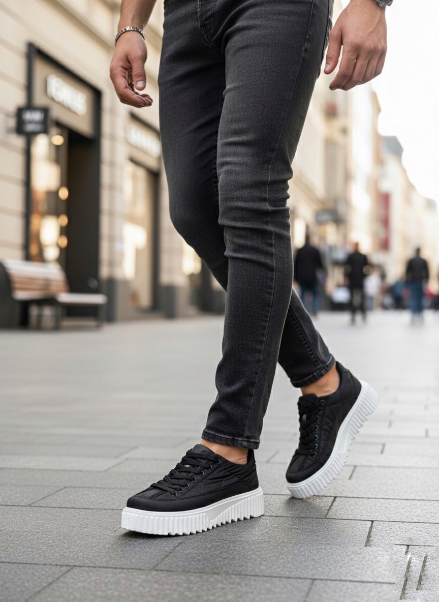 • MirgeShoes Siyah Bağcıklı Erkek Casual Ayakkabı Paraşüt Kumaş Tırtıklı Yüksek BYZ Taban MRG010603119