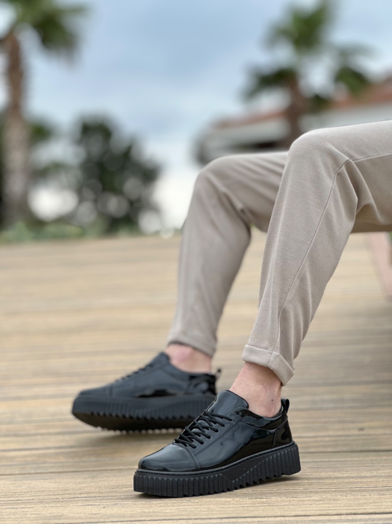 MirgeShoes Siyah Bağcıklı Erkek Casual Spor Rugan Ayakkabı Yüksek Kalın Siyah Taban MRG010610422