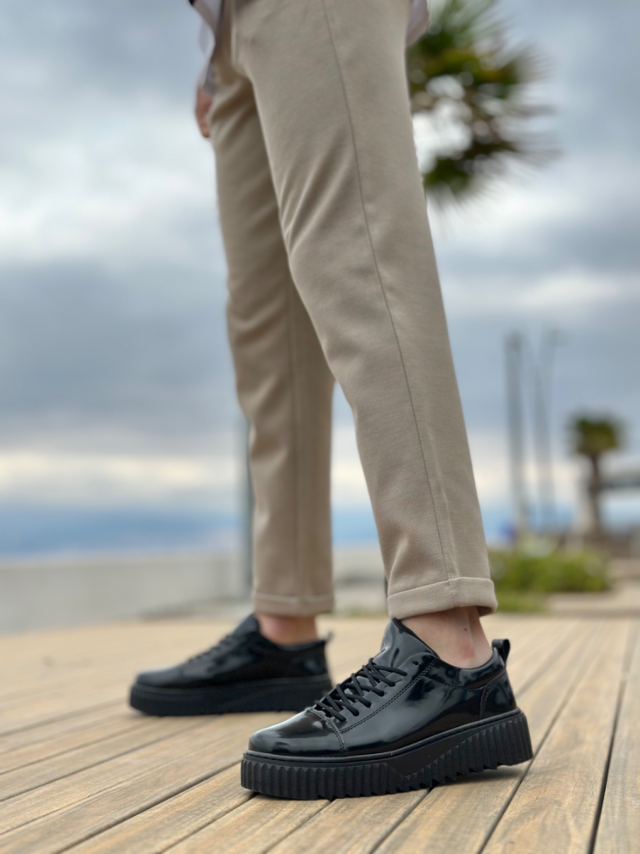 • MirgeShoes Siyah Bağcıklı Erkek Casual Spor Rugan Ayakkabı Yüksek Kalın Siyah Taban MRG010610422