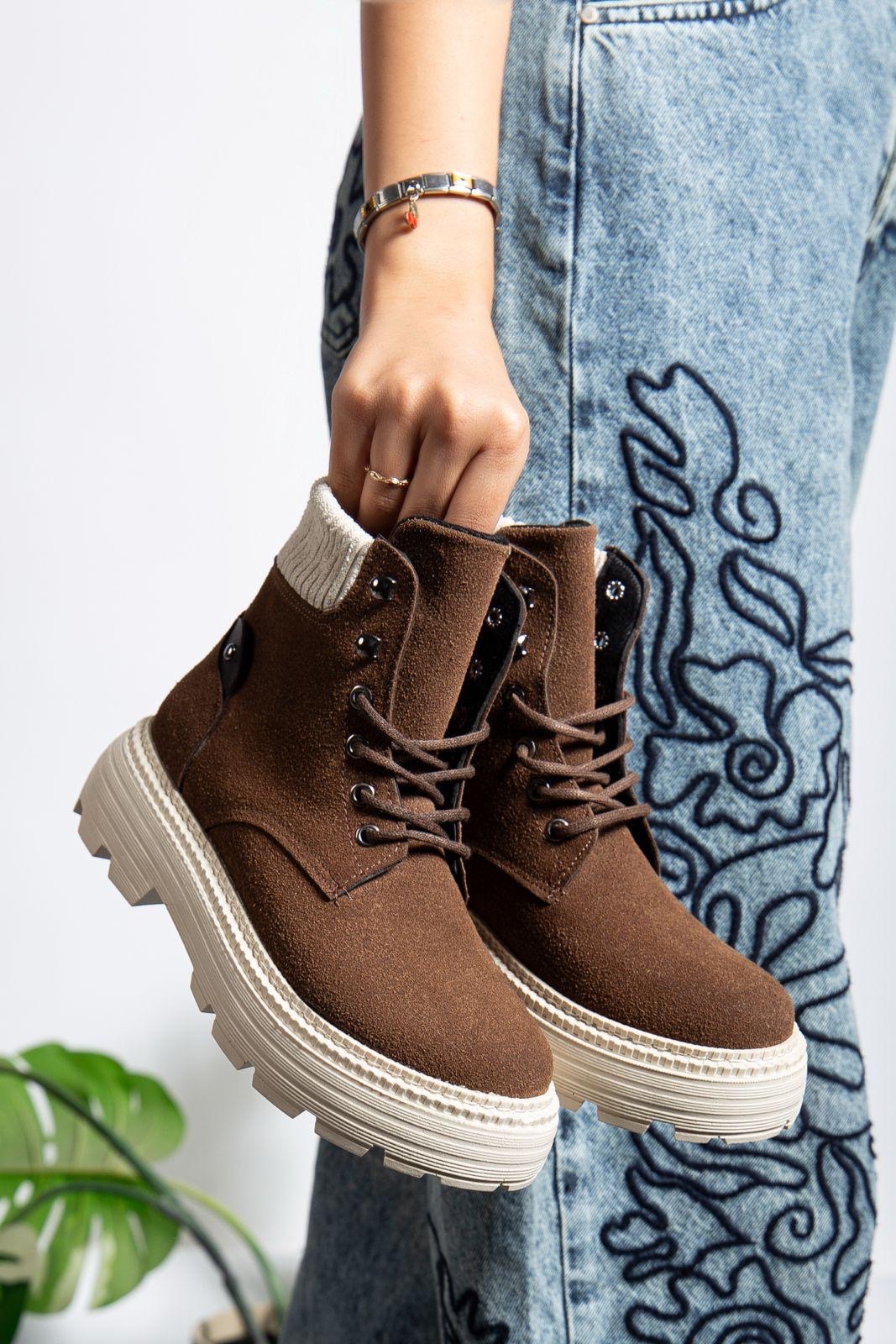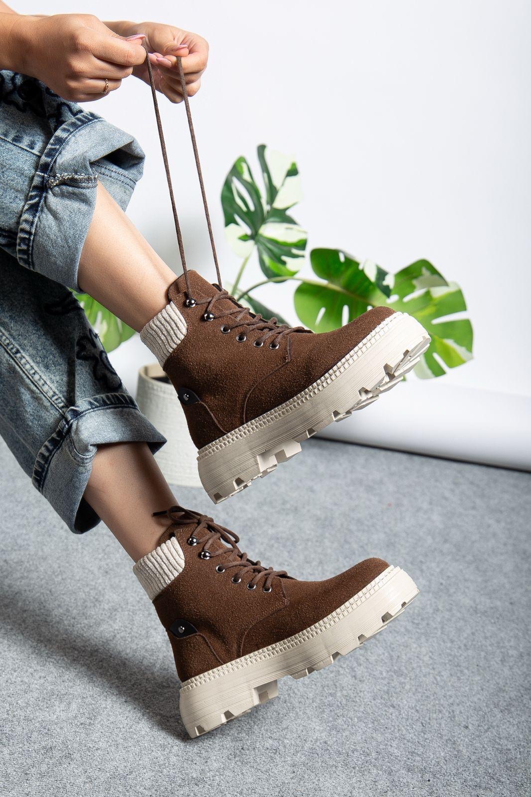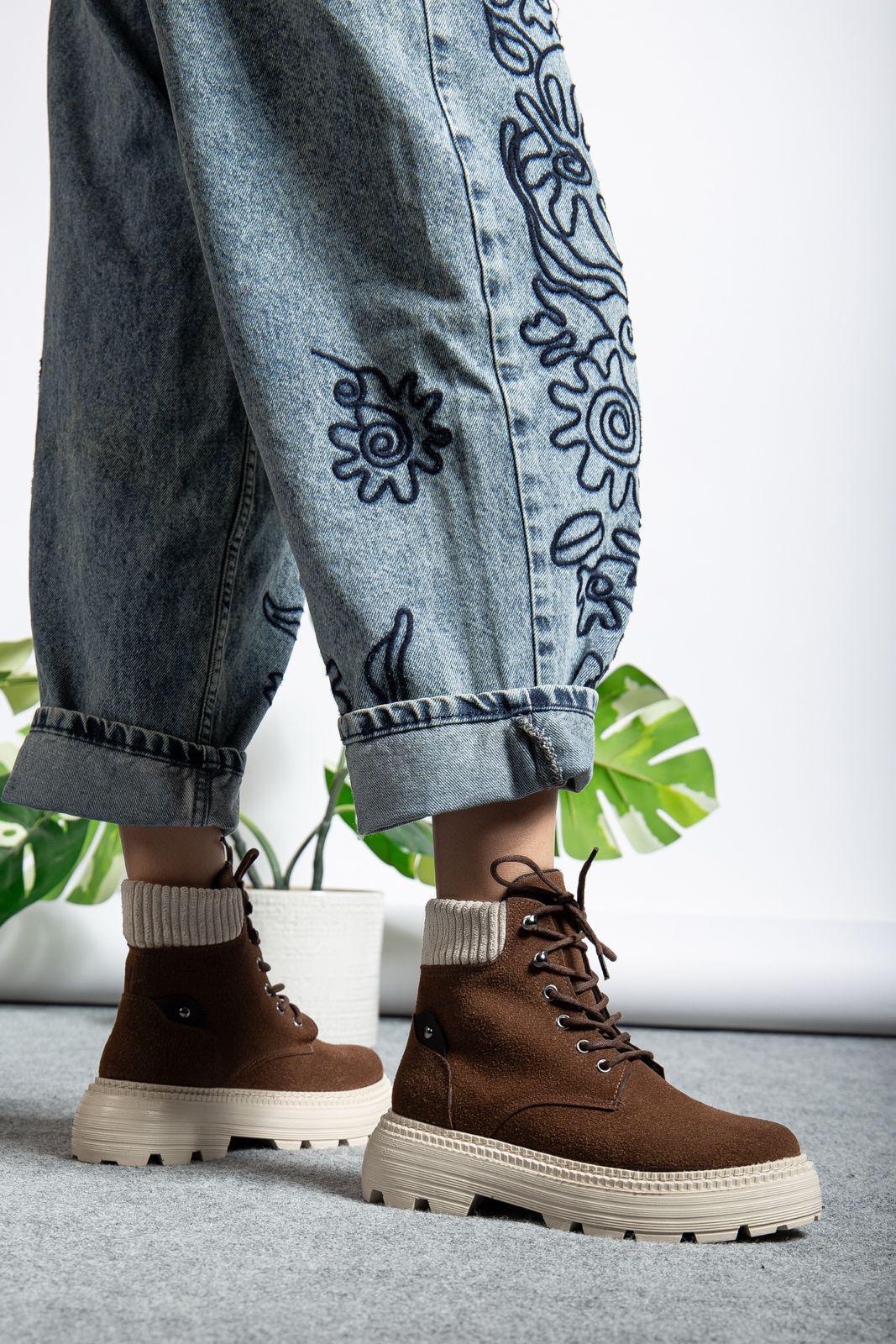 • MirgeShoes Kahve Bağcıklı Kadın Worker Bot Rahat Yüksek Kalın Taban MRG01062323