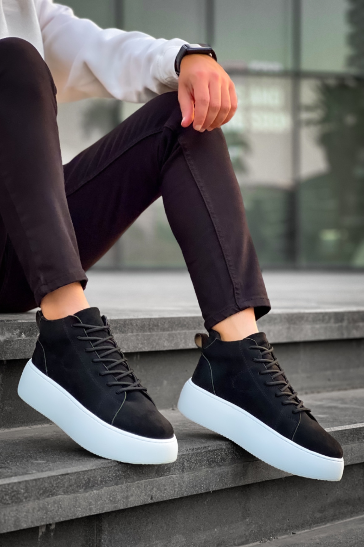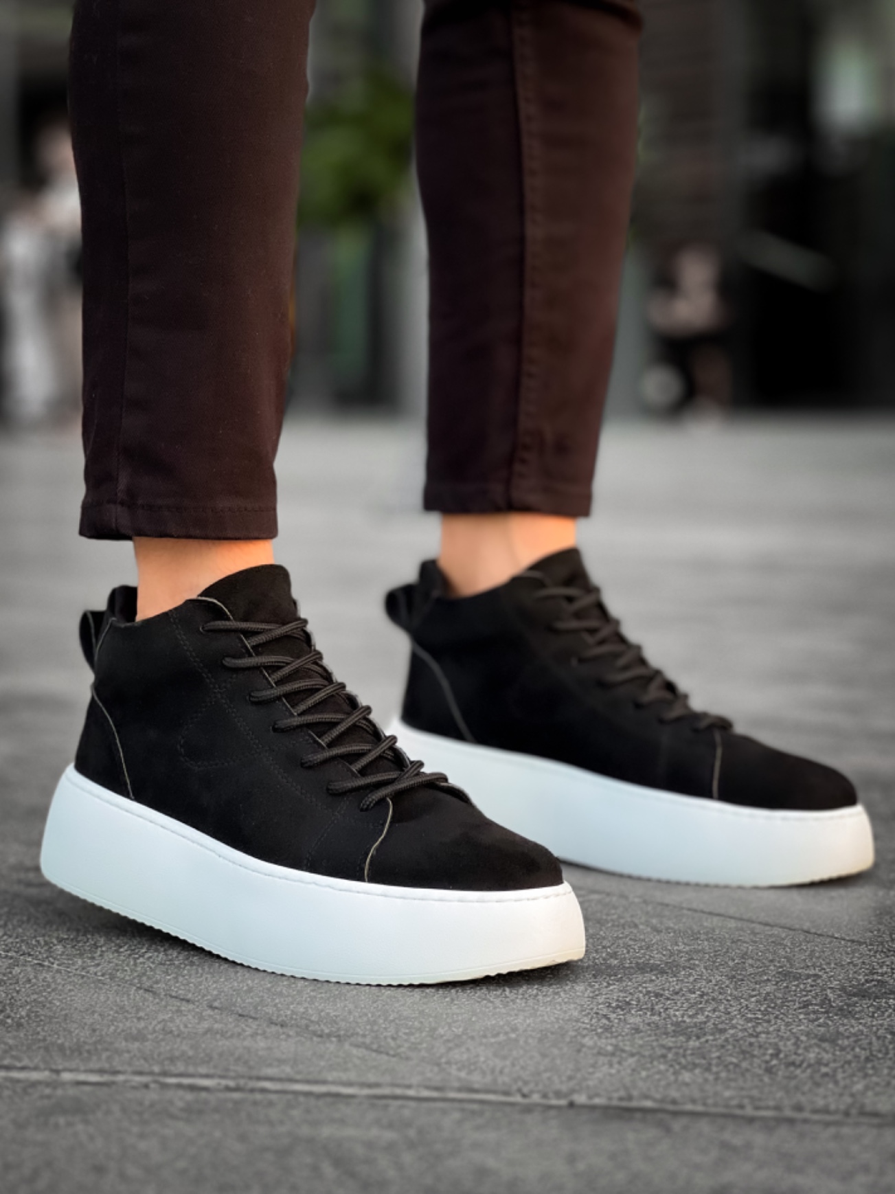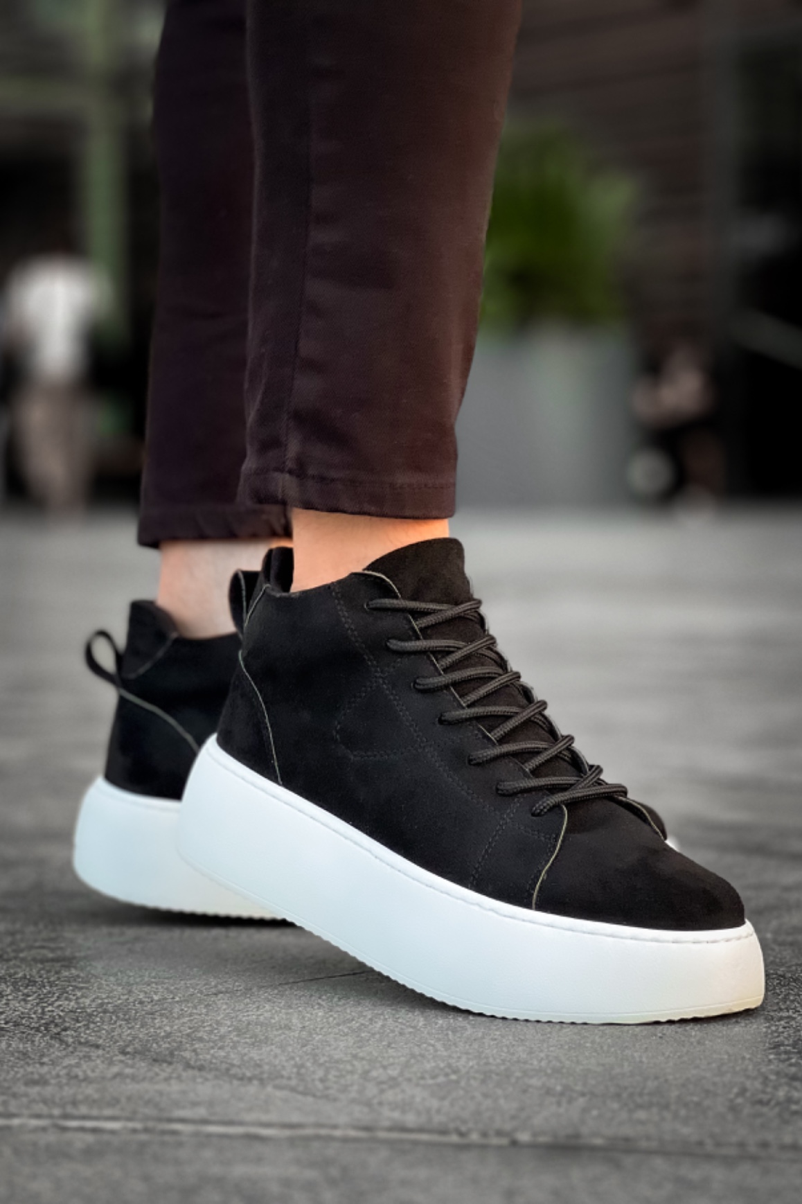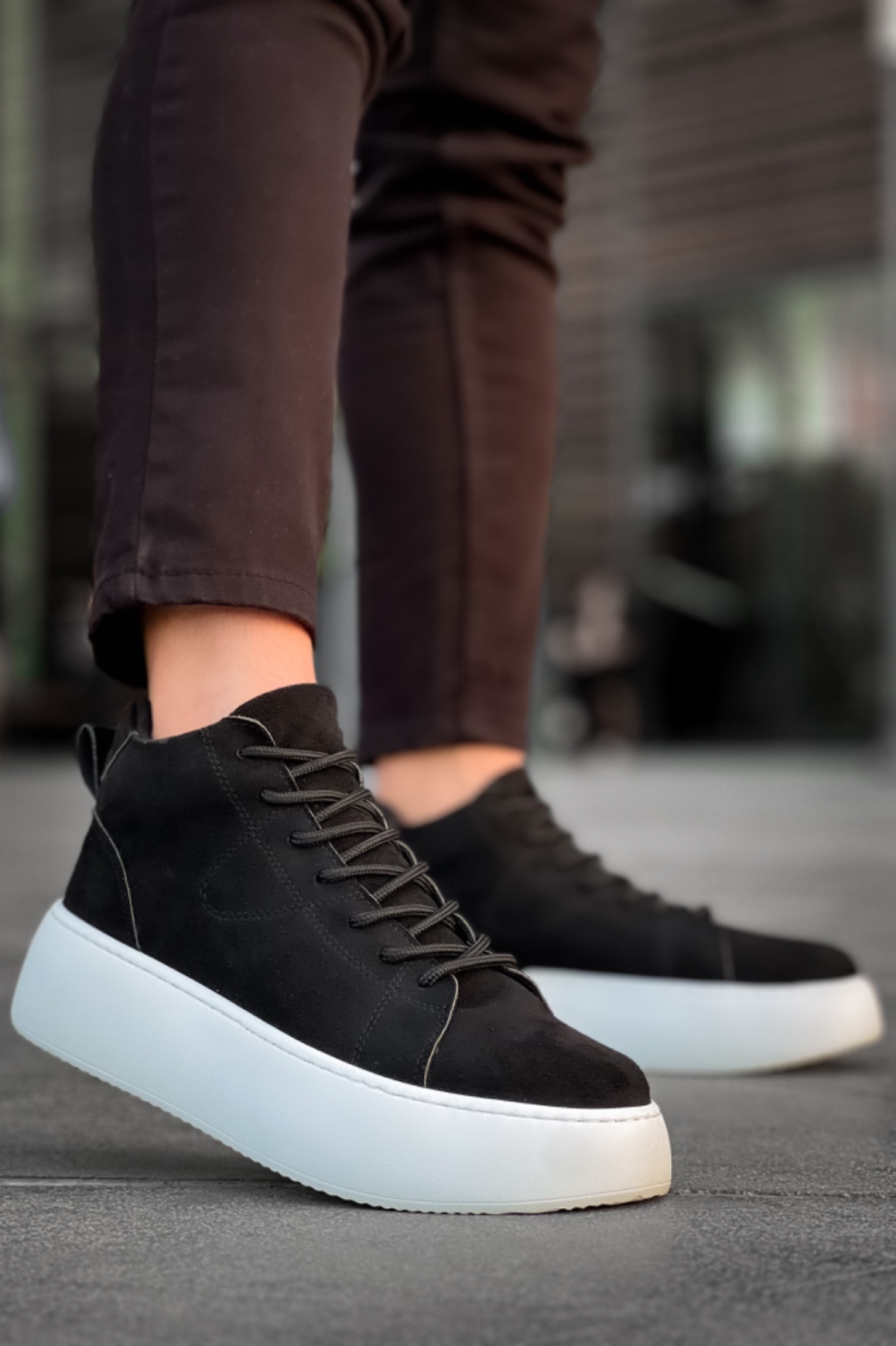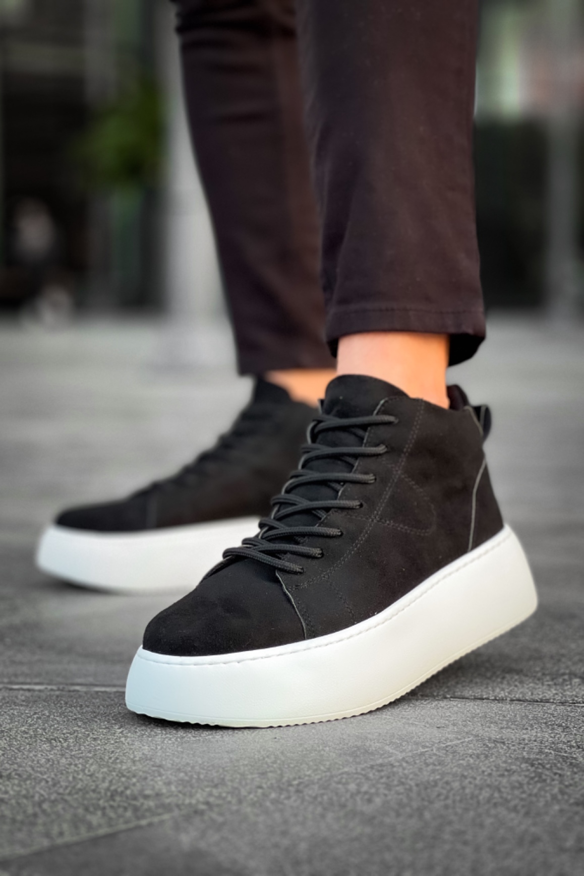 MirgeShoes Siyah Bağcıklı Erkek Spor Bot Süet Deri Rahat Yüksek Kalın Beyaz Taban SYH MRG01062328