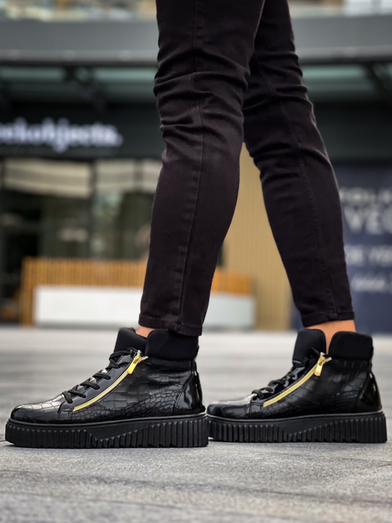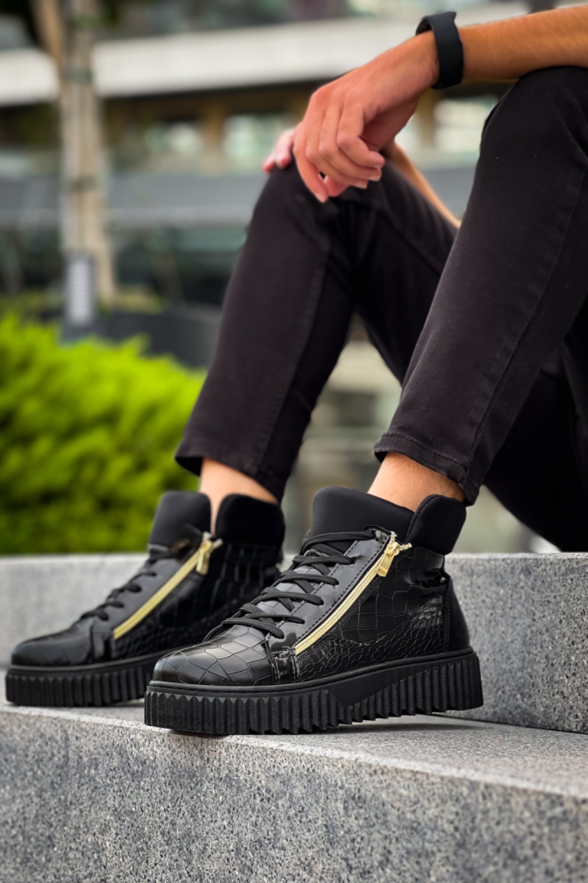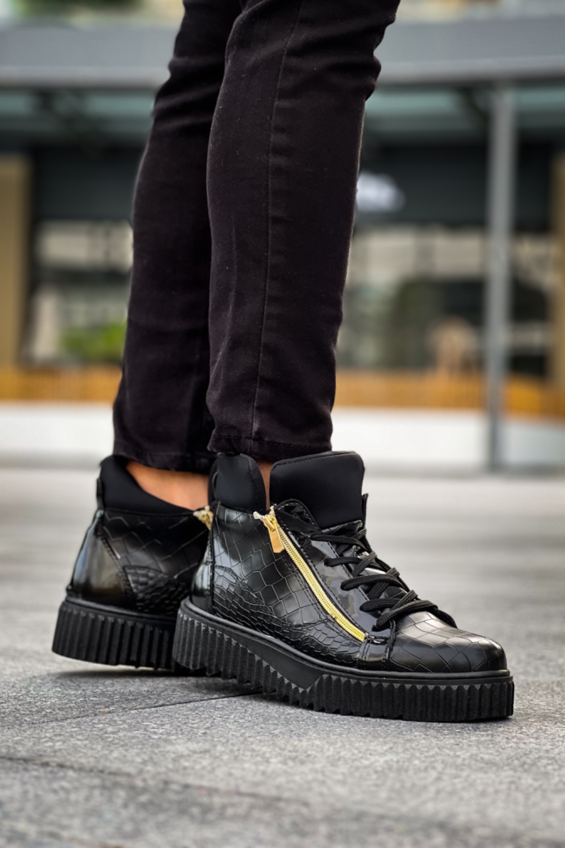 MirgeShoes Siyah Çift Fermuarlı Erkek Spor Bot Rahat Deri Kalın Yüksek Siyah Taban MRG01062830