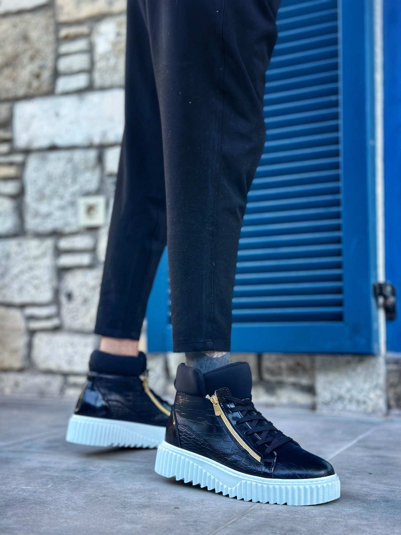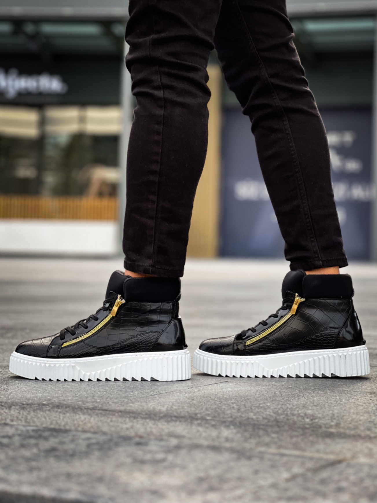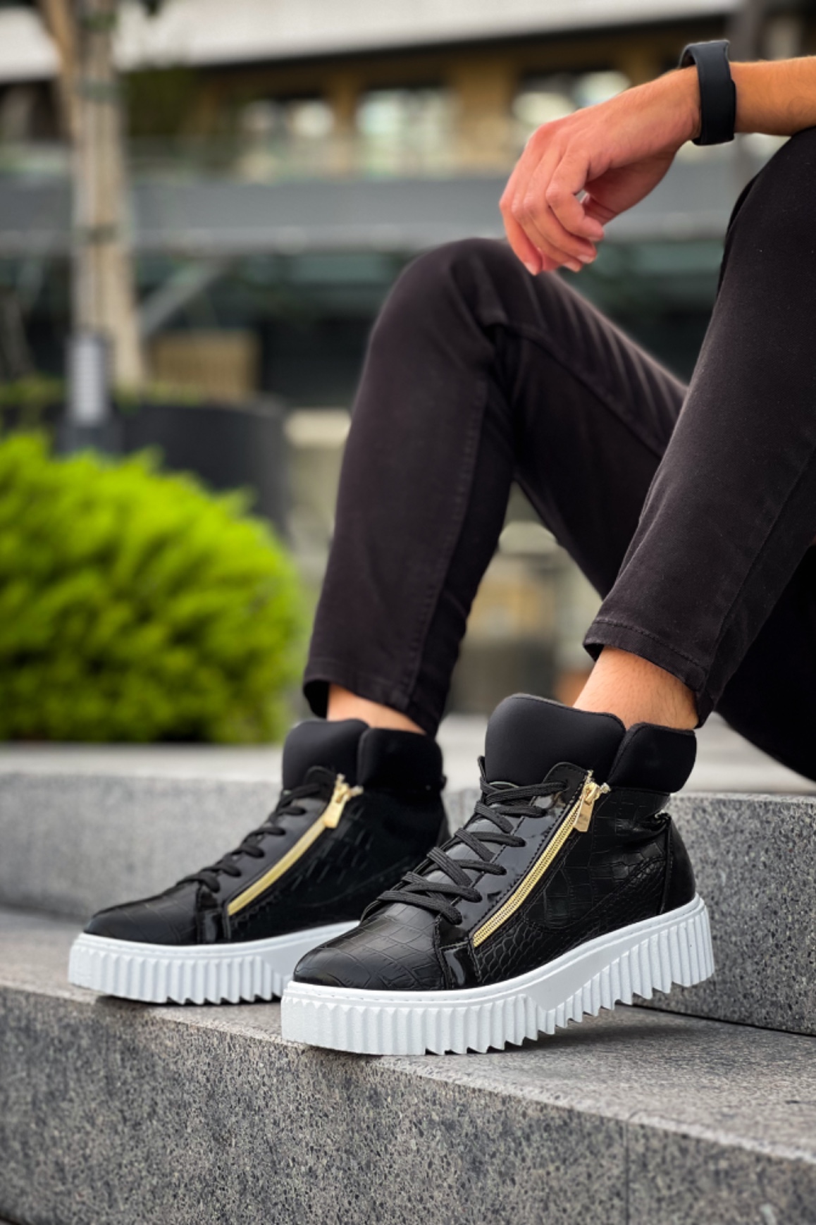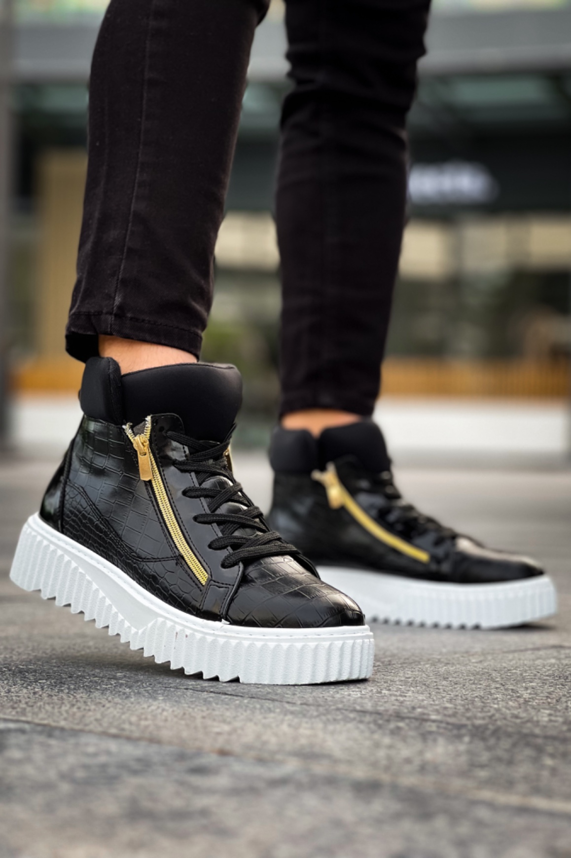 • MirgeShoes Siyah Çift Fermuarlı Erkek Spor Bot Rahat Deri Kalın Yüksek Beyaz Taban MRG01062830
