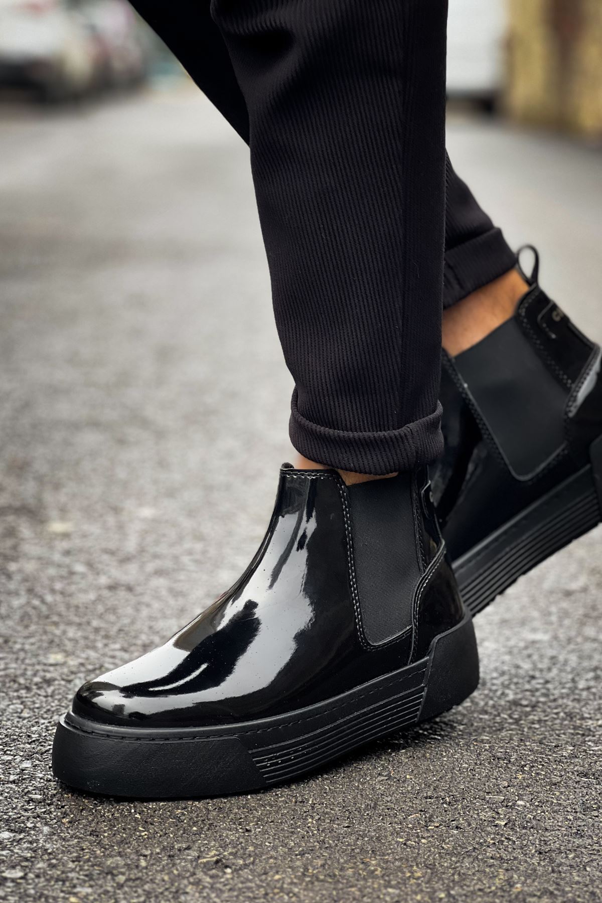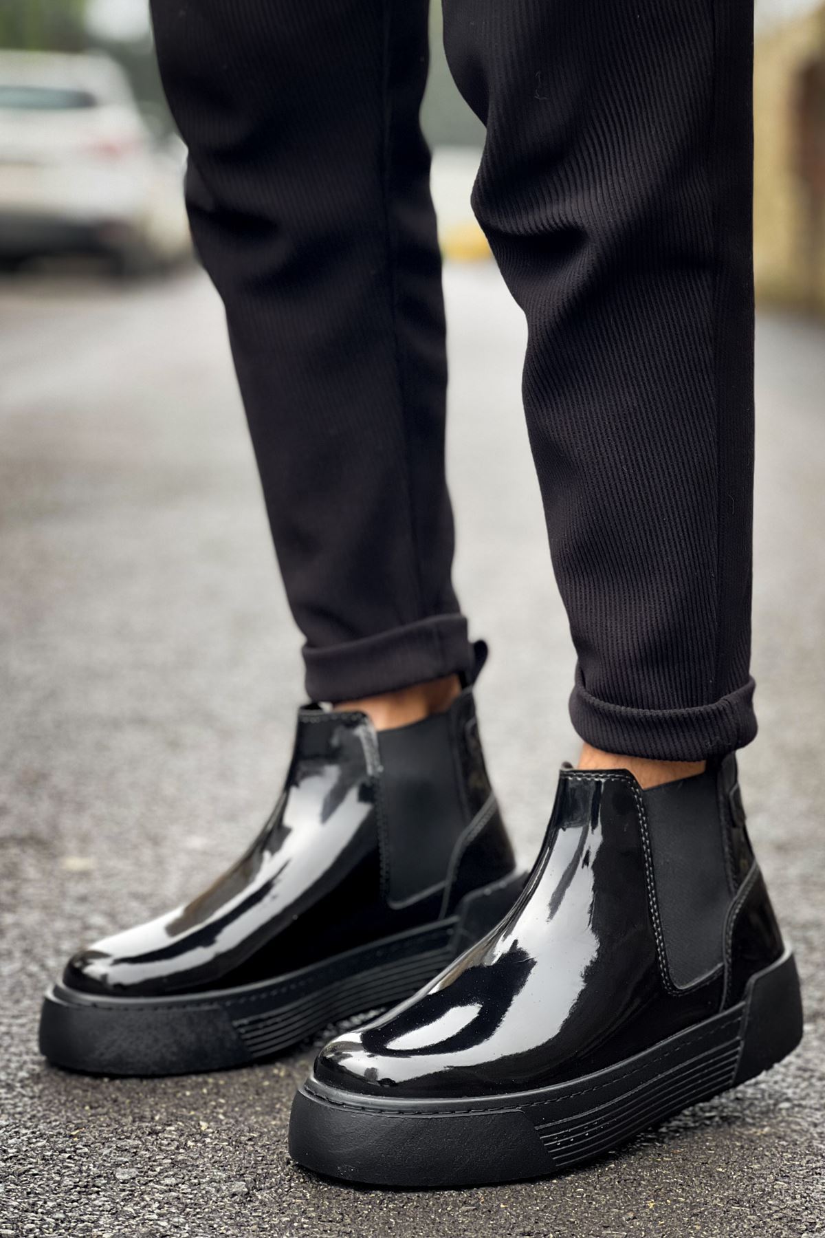 MirgeShoes Parlak Siyah Bağcıksız Erkek Chelsea Bot Lastikli Kalın SYH Taban MRG010602387