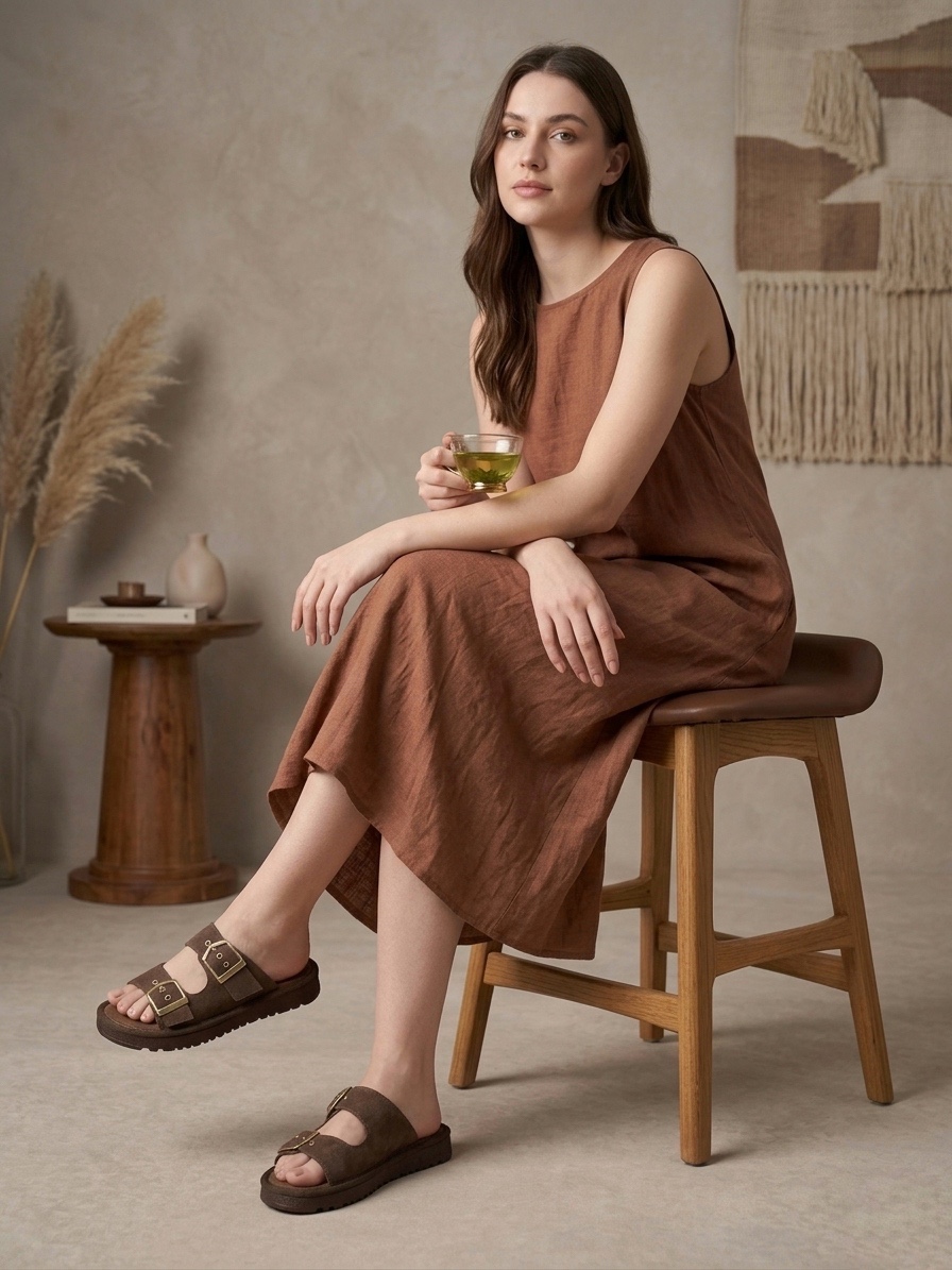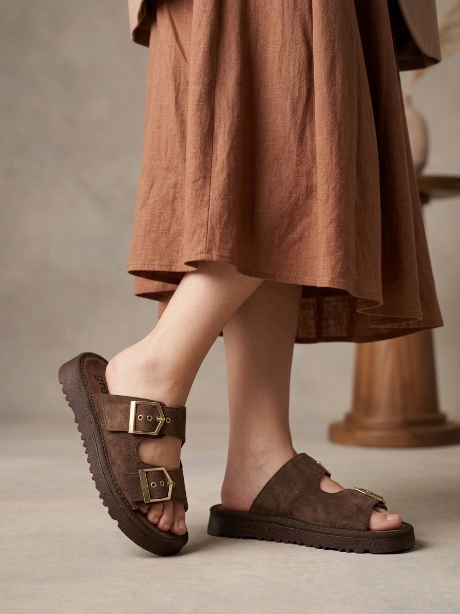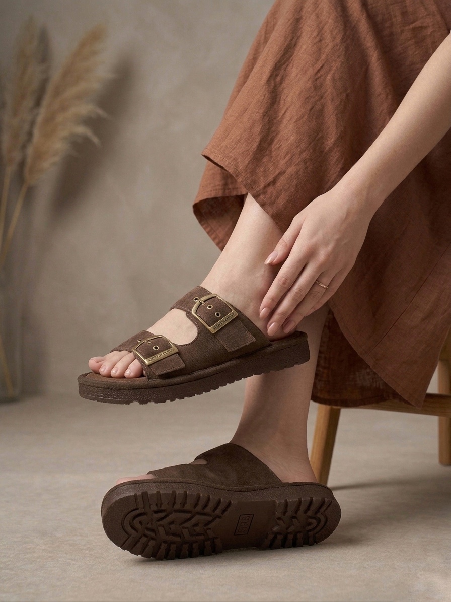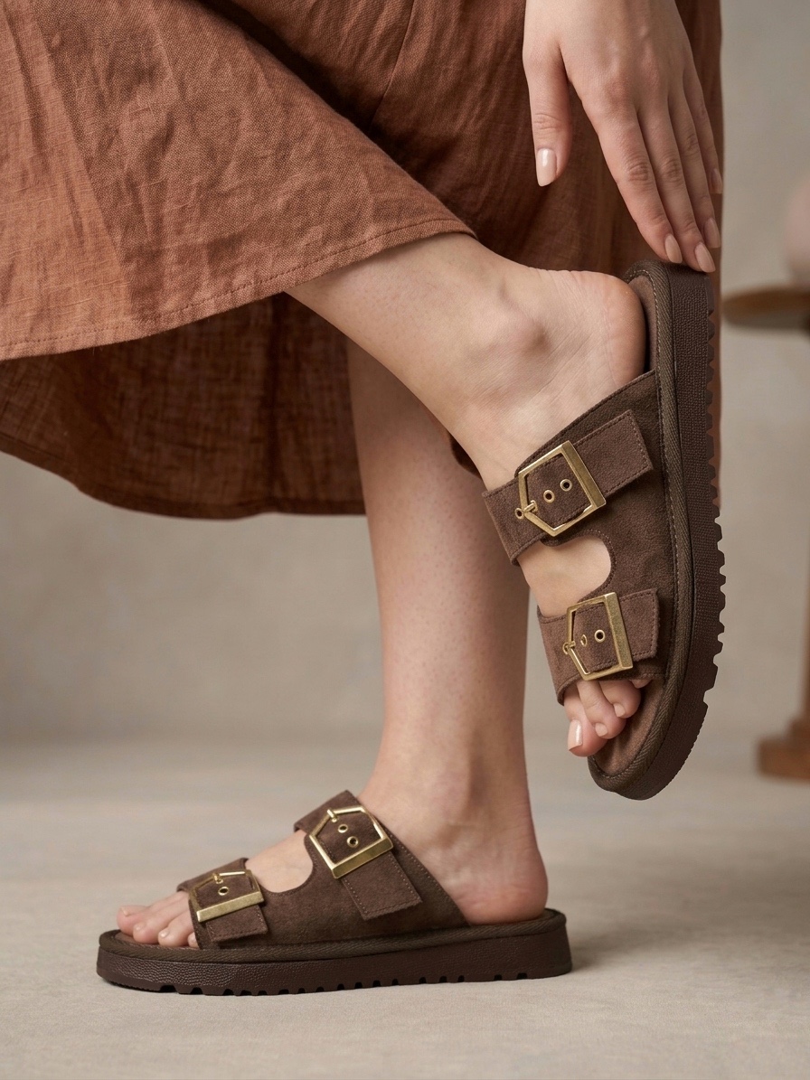Yazlık Kadın Kahverengi İnce Taban Tokalı Terlik