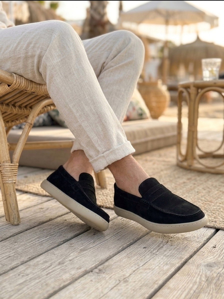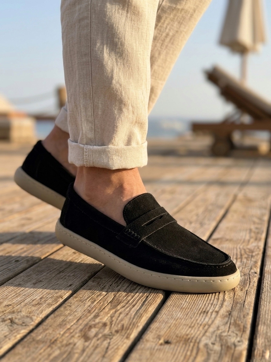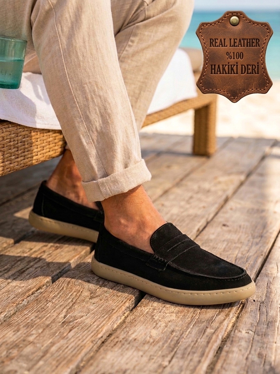 • MRG0251 %100 İçi Dışı Hakiki Deri Erkek Siyah Süet Casual Loafer Kauçuk Rahat Taban Dikişli Ayakkabı